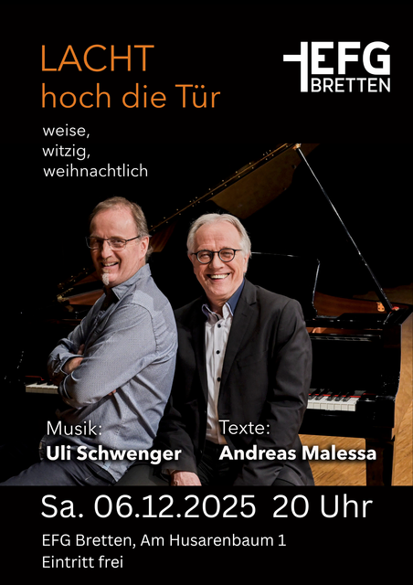 BRETTEN. Am 06.12.2025 / 20:00 Uhr / EFG Bretten Gemeindezentrum (Am Husarenbaum 1, 75015 Bretten) Ein Abend für alle Sinne in der EFG Bretten Am Samstag, 6. Dezember 2025, erwartet die Besucher der Evangelisch-Freien Gemeinde Bretten ein außergewöhnliches Kultur- und Musikprogramm. Unter dem Titel „Lacht hoch die Tür – Weise, witzig, weihnachtlich“ verbinden der bekannte Hörfunkjournalist und Theologe Andreas Malessa sowie der virtuose Pianist Uli Schwenger Humor, Tiefgang und musikalische...