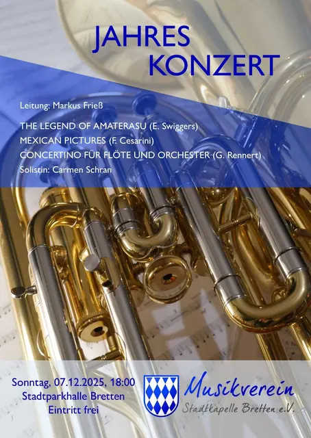 Bretten - Der Musikverein/Stadtkapelle Bretten e.V. lädt am Sonntag, den 7. Dezember 2025 um 18 Uhr in die Stadtparkhalle Bretten zum Jahreskonzert ein. Die Jugendkapelle, die seit diesem Jahr ebenfalls unter der Leitung von Markus Frieß steht, wird in gewohnter Weise das Konzert eröffnen. Im Anschluss daran wird die Stadtkapelle Bretten mit einem abwechslungsreichen Konzertprogramm die Welt der sinfonischen Blasmusik vorstellen. Nach einer Fanfare und Hymne für den Frieden erwartet die...