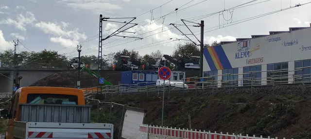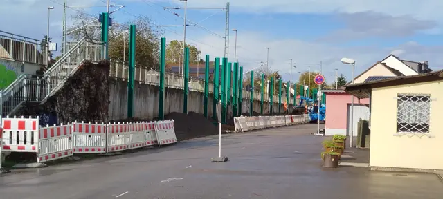 Unten am Langwiesenweg arbeitet ein Trupp Männer an der Lärmschutzwand.