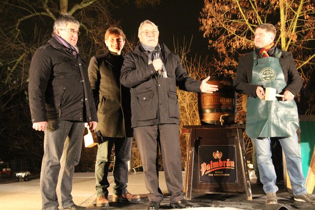 Bereits vor der Feier sorgte im Kino die Übertragung des Silvesterkonzertes aus der Berliner Philharmonie und die Silvester-Soiree in der Stadtbücherei für die passende Einstimmung. Und schon der erste Programmpunkt der Silvesterparty zeigte, was in Bretten und der Region steckt; Die beiden Jubiläumsbiere "Zwölf Fuffzich" und "Jubidu" der Brauereien Hoepfner und Palmbräu wurden von OB Wolff und dem Oberbürgermeister der Lutherstadt Wittenberg, Thorsten Zugehör, sowie Vertretern der Brauereien zeremionell angestochen und bildeten den Startschuss für die Silvesterfeier.