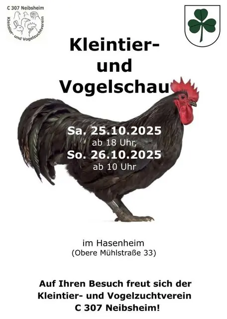 Der Kleintier- und Vogelzuchtverein C 307 Neibsheim lädt herzlich zur Kleintier- und Vogelschau am 25.10.2025 ab 18 Uhr und 26.10.2025 ab 10 Uhr ins Hasenheim (Obere Mühlstraße 33) ein. Für Speis und Trank ist bestens gesorgt. Auf Ihren Besuch freut sich der Verein!