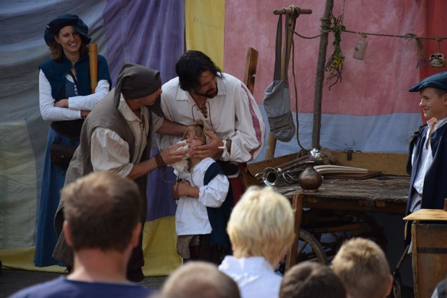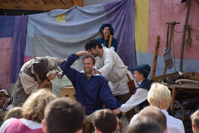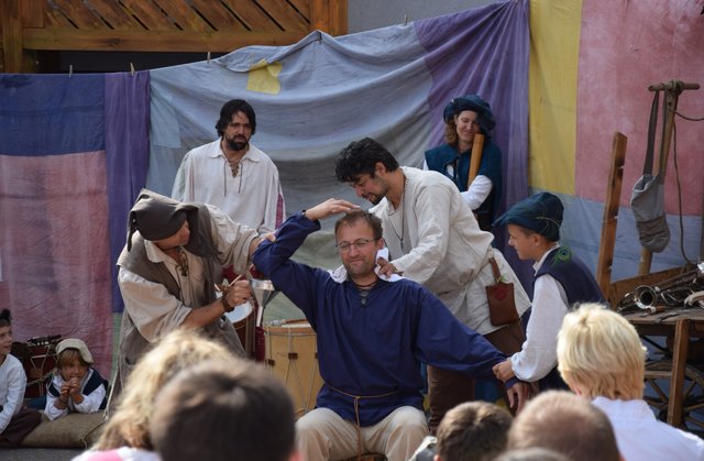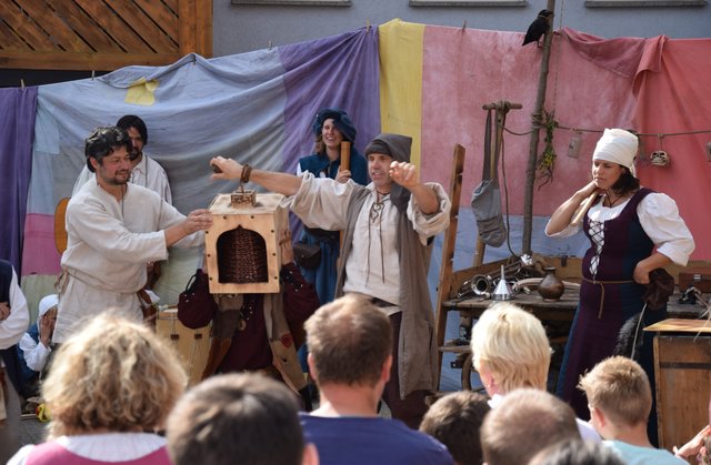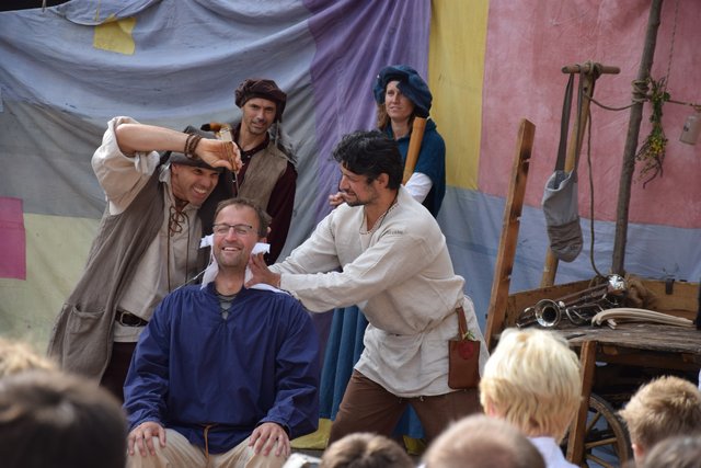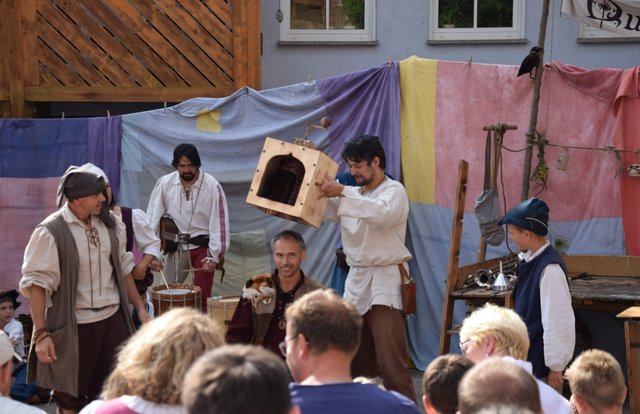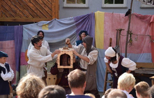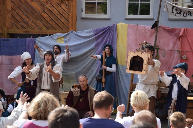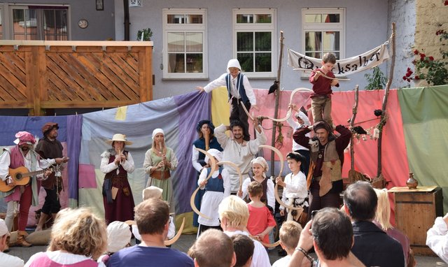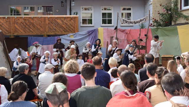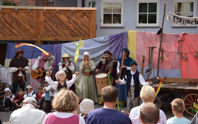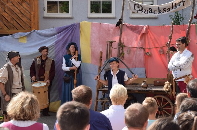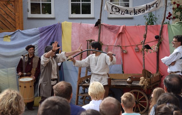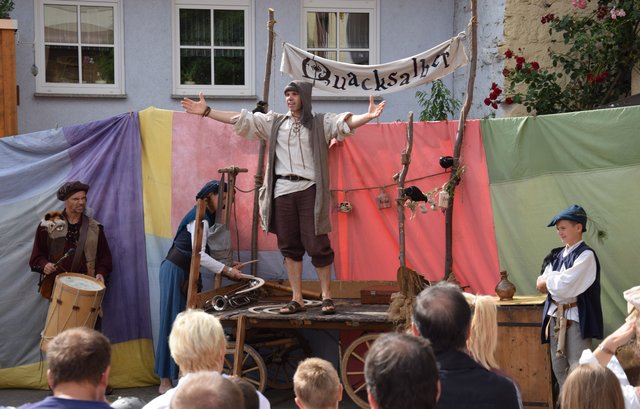 Gestandene Männer, liebliche Frauen und Kinder ohne Zahl staunten in der Bessergasse am Samstagnachmittag ab der fünften Stunde, wie der Quacksalber, assistiert von Minimus und Minimi, einen Hans (aus dem Publikum) nach dem anderen mit seinem Wundermittel „Furioso“ kurierte. Seine Kunst erschien bisweilen so unglaublich, dass das Volk nicht aus dem Lachen herauskam. Selbst die Musikantinnen der Truppe schienen zwischen Verblüffung und Heiterkeit zu schwanken. Für allseits gelöste Stimmung sorgten auch die kurzweiligen musikalischen, artistischen und Tanzeinlagen der kinderreichen Komödianten aus Gölshausen. Prädikat: Sehenswert.