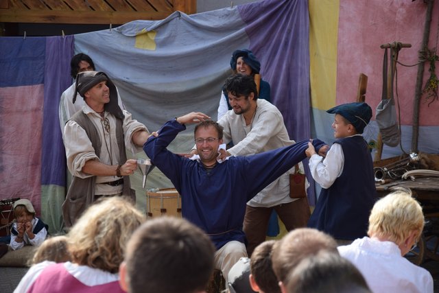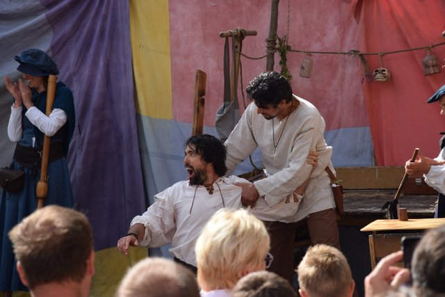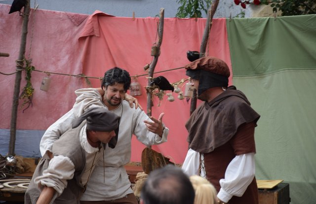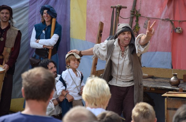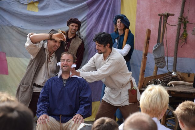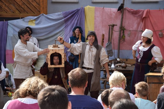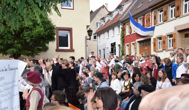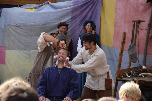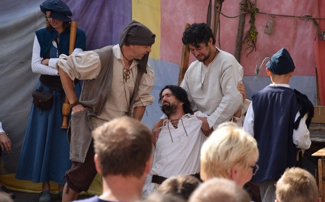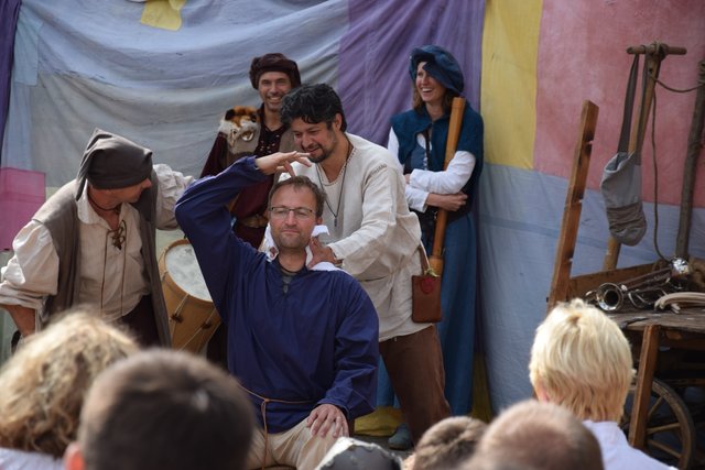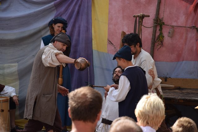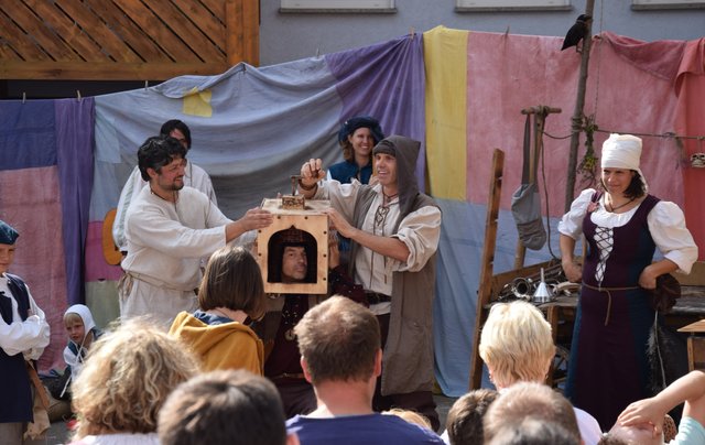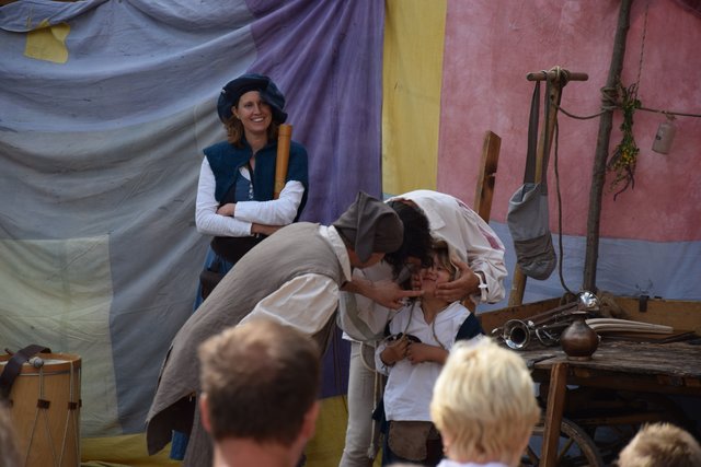 Gestandene Männer, liebliche Frauen und Kinder ohne Zahl staunten in der Bessergasse am Samstagnachmittag ab der fünften Stunde, wie der Quacksalber, assistiert von Minimus und Minimi, einen Hans (aus dem Publikum) nach dem anderen mit seinem Wundermittel „Furioso“ kurierte. Seine Kunst erschien bisweilen so unglaublich, dass das Volk nicht aus dem Lachen herauskam. Selbst die Musikantinnen der Truppe schienen zwischen Verblüffung und Heiterkeit zu schwanken. Für allseits gelöste Stimmung sorgten auch die kurzweiligen musikalischen, artistischen und Tanzeinlagen der kinderreichen Komödianten aus Gölshausen. Prädikat: Sehenswert.