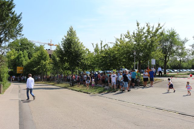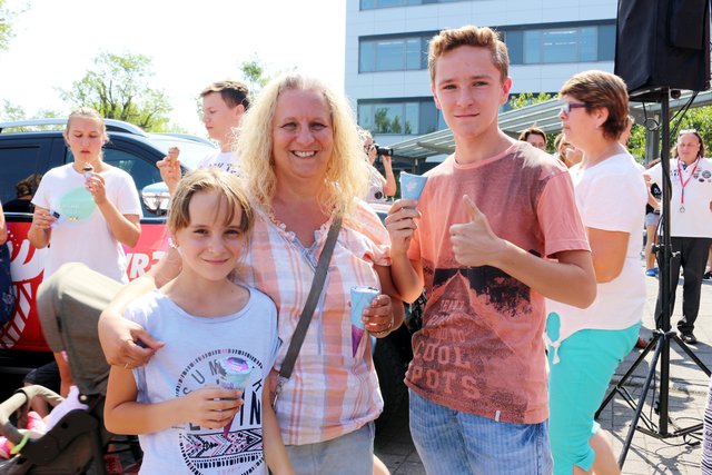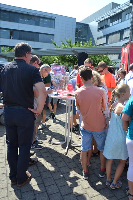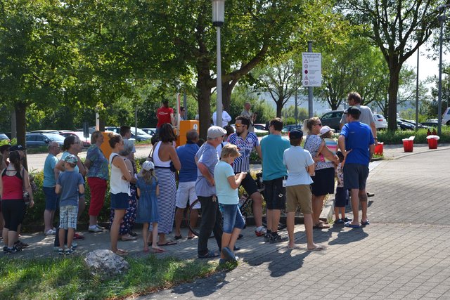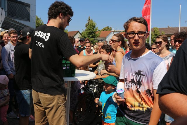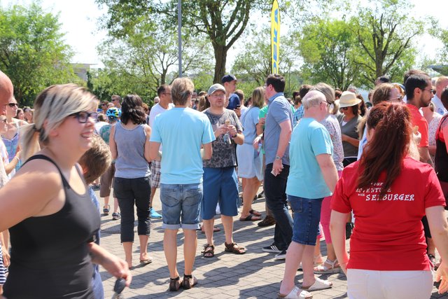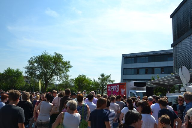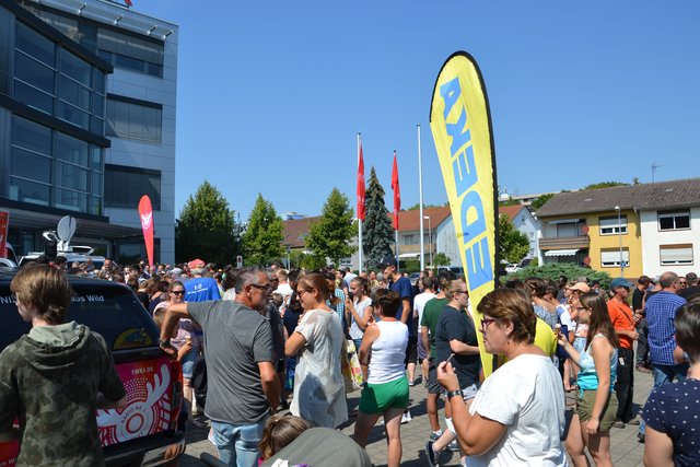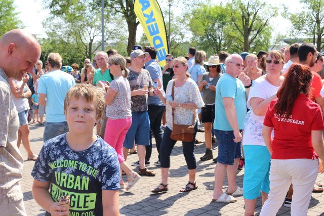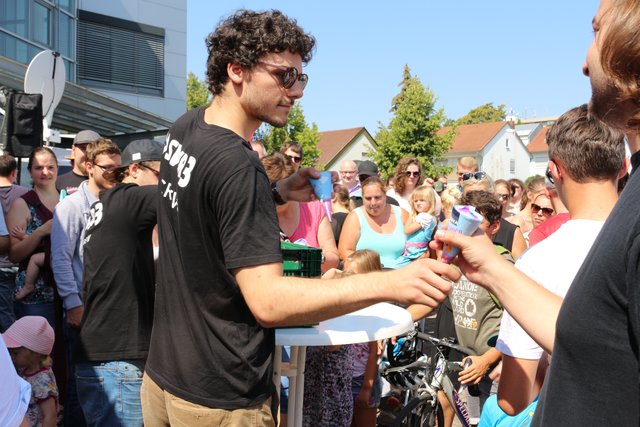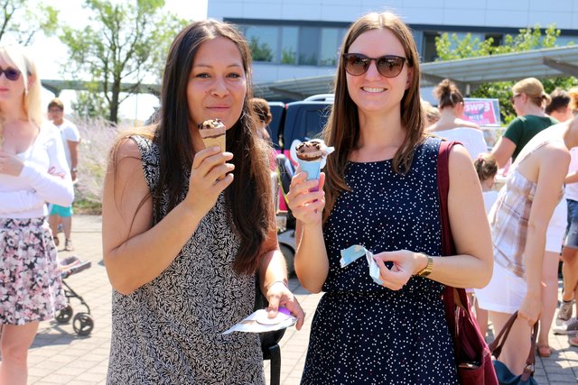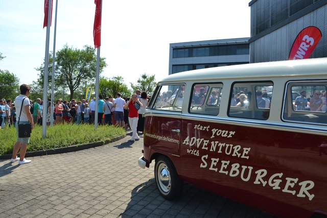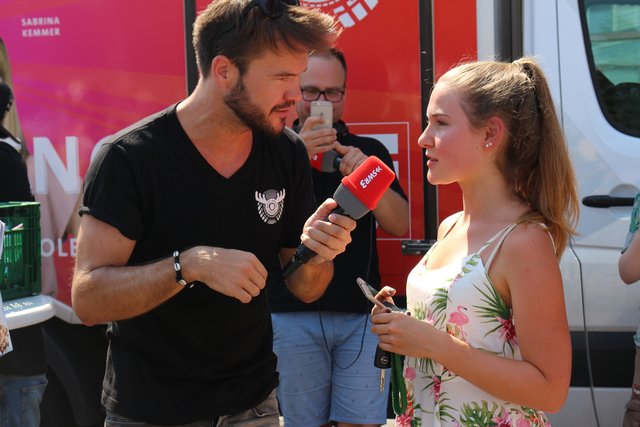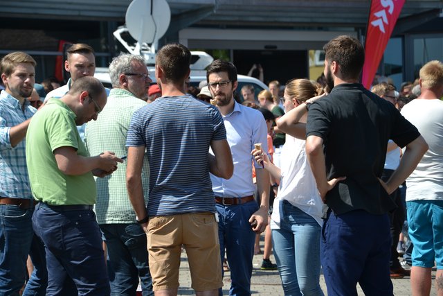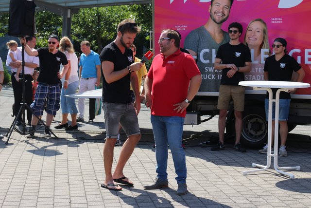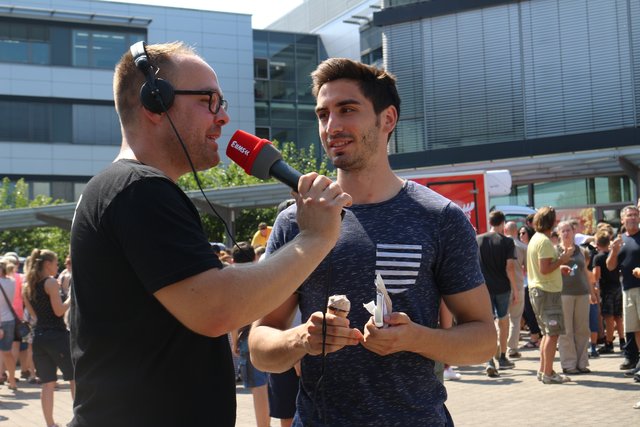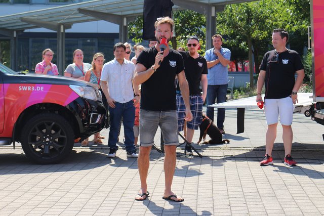 „Mir wurde gesagt, Seeburger ist eine Software-Firma. Wir haben hier also auch Software-Entwickler, die nie Sonnenlicht sehen – auch ein ‚Hallo!‘ an euch“, scherzte Müller und winkte dem Publikum zu, welche das Geschehen lieber vom Gebäude aus verfolgte. Für den Eistruck in Bretten hatte die Seeburger AG gesorgt, die am Freitag, 3. August, live im Radio als Tagessieger aus der „SWR3 Eis-Challenge“ hervorging. Daniel Bonnal hatte mit einem Team aus seiner Firma mitgemacht und beim Lösen der Aufgabe über soziale Netzwerke Unterstützung aus der Region erhalten.