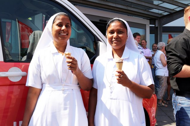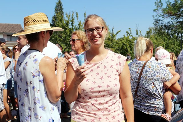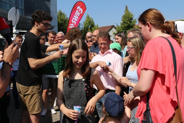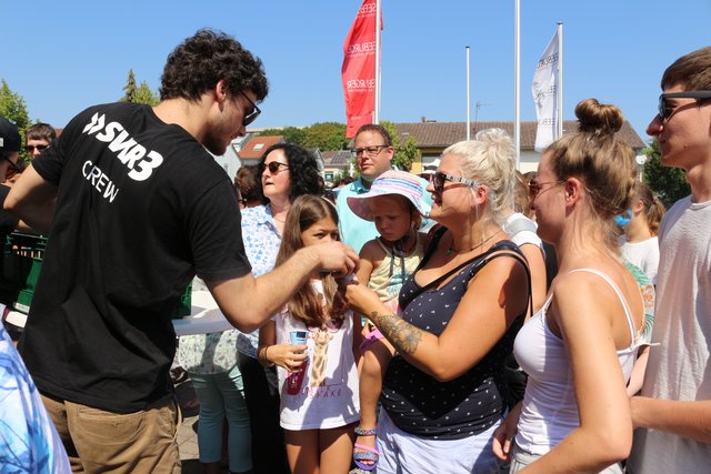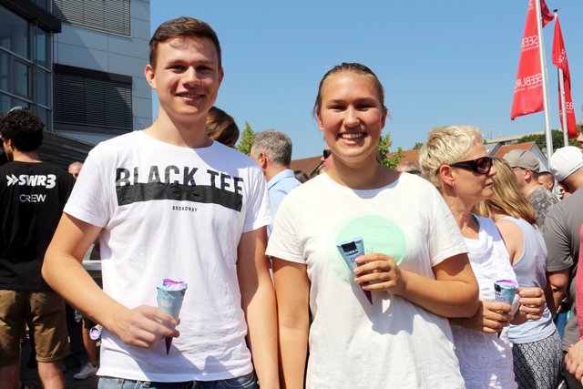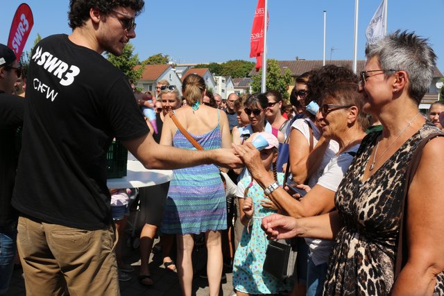 Auch Moderator Sebastian Müller war zufrieden: „Es hat richtig Spaß gemacht in Bretten! Trotz mangelndem Schatten hat sich eine lange Schlange gebildet und es sind alle geduldig angestanden und wir haben mehr als 2.000 Eistüten verteilt. Neben den Mitarbeiterinnen und Mitarbeitern der Firma waren viele Kinder, Dachdecker, Mitarbeiter und Ärzte von der Klinik nebenan gekommen, um sich ein Eis zu holen. Außerdem wurde ich über den Mops, Brettens Wahrzeichen, aufgeklärt. Man lernt immer wieder was dazu."