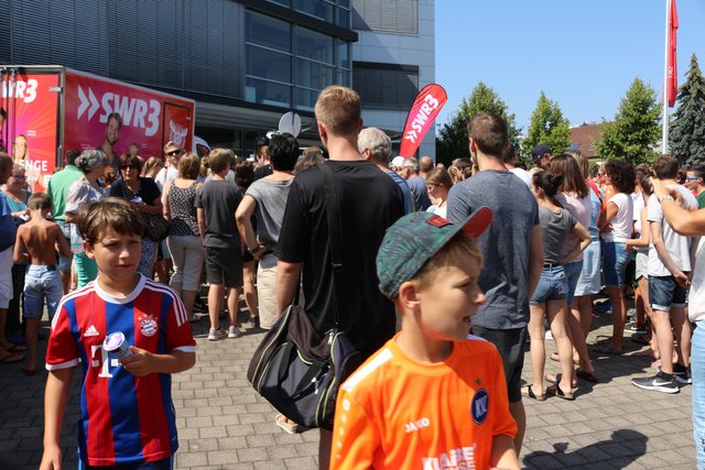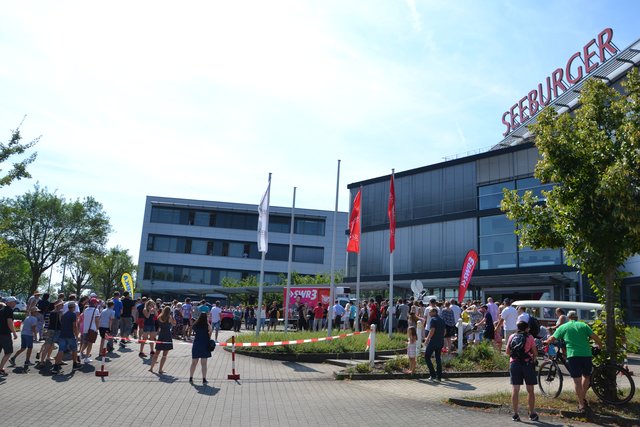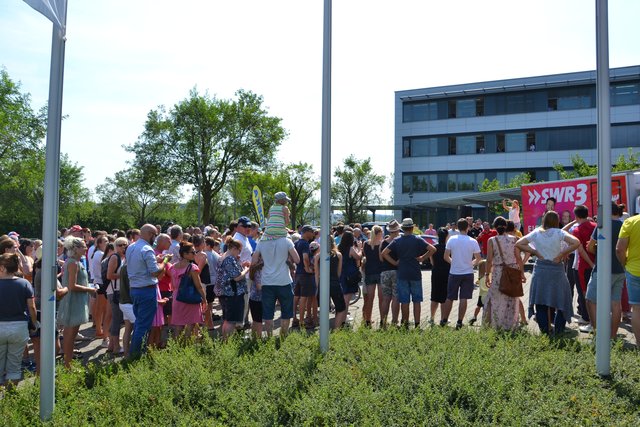 Bretten (hk/pm) Bereits weit vor 12 Uhr zog sich eine lange Menschenschlange von der Edisonstraße Richtung Herrmann-Beuttenmüller-Straße: Beschäftigte von der Seeburger AG sowie viele andere Menschen, die sich eine sommerliche Erfrischung nicht entgehen lassen wollten, wurden vom „SWR3 Eis-Challenge“-Team zum Gratis-Eis eingeladen. Dazu war das SWR3-Team samt Eistruck nach Bretten angereist und verteilte auf dem Firmengelände Gratis-Eis für jeden, der gekommen war. Mehrere hundert Menschen versammelten sich um den Eistruck und SWR3-Moderator Sebastian Müller für einen Mini-Urlaub in der Mittagszeit.