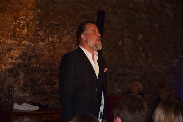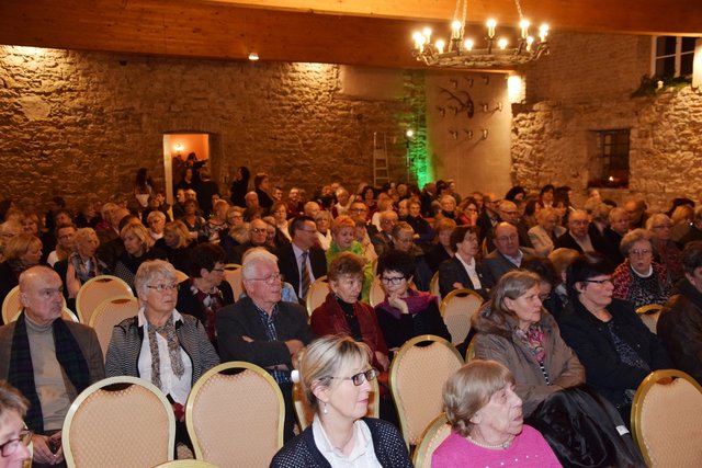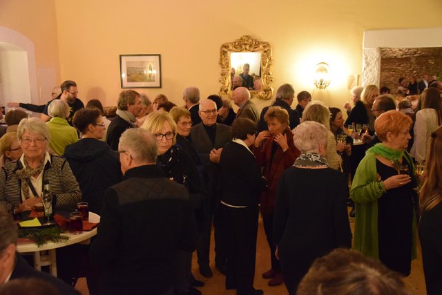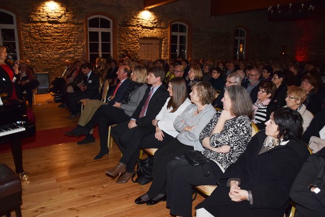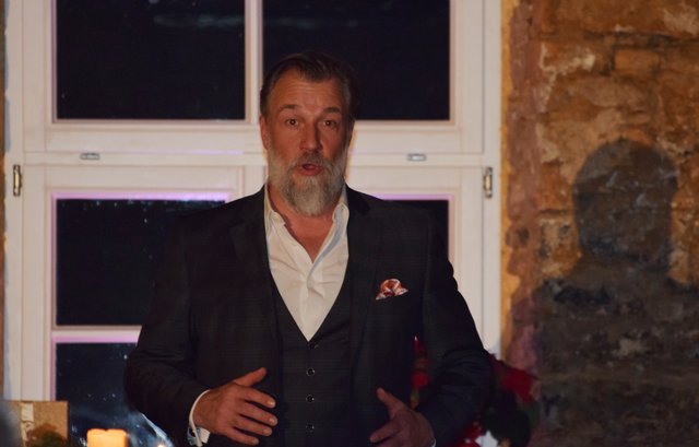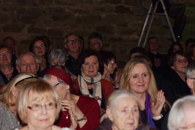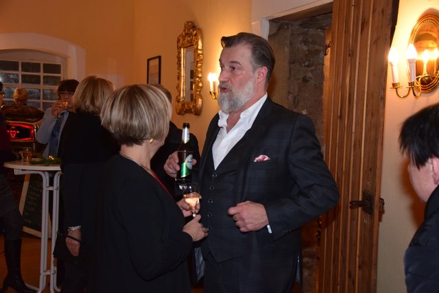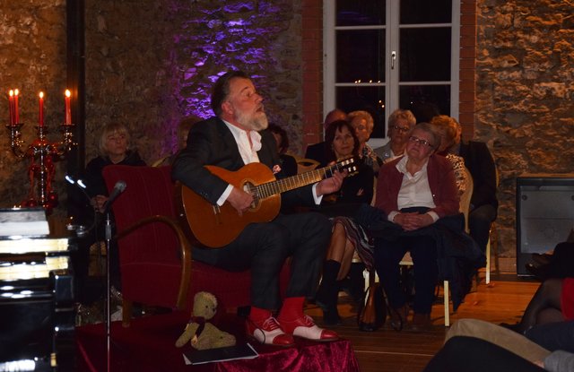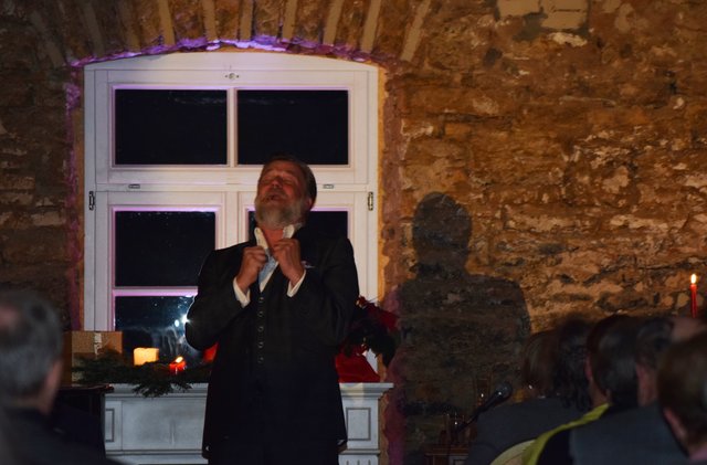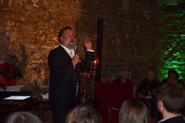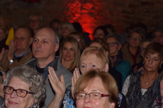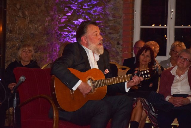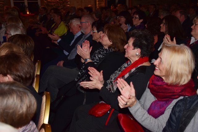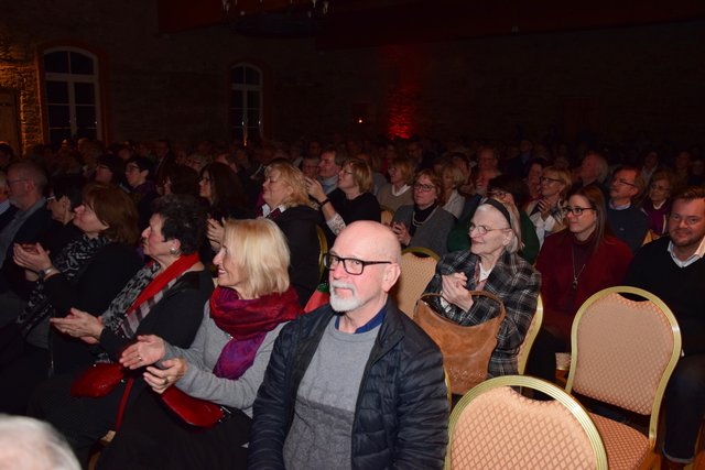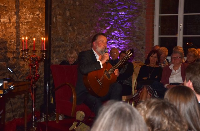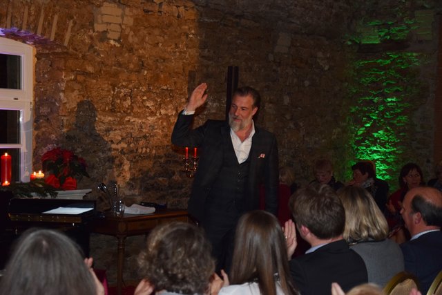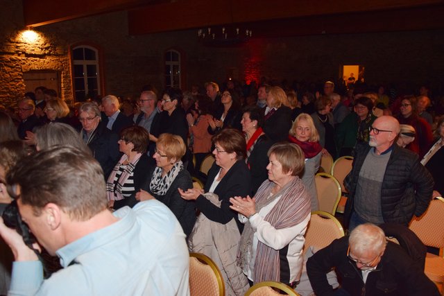 Doch es wurde nicht nur gesungen. Zwischen den einzelnen Liedern nahm Marshall auch immer wieder im roten Sessel auf der Bühne Platz, um aus mitgebrachten und eigens für den Abend ausgewählten Texten vorzulesen. Und bei den Texten setzte Marshall den roten Faden des Abends fort. Sie alle hatten einen Bezug zu Weihnachten oder Nächstenliebe, waren aber immer wieder unterschiedlich in ihrer Ausrichtung. Einige Texte regten zum Nachdenken, andere wiederum zum Schmunzeln an, etwa wenn der Kabarettist Klaus Peter Schreiner in seinem Gedicht „Der Weihnachtsbaum spricht” eine Tanne zu Wort kommen lässt. Am Ende des Konzertabends stand ein begeistertes Publikum minutenlang applaudierend im großen Saal des Gutshauses. Eine Zugabe war da natürlich obligatorisch und doch fiel sie, wie es zu diesem Abend passte, besinnlich, ergreifend und mitreißend aus.
