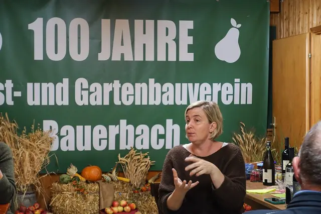 Auf dem Gelände und im Vereinsheim des Obst- und Gartenbauvereins Bauerbach zeigte die Weinerlebnisführerin Michaela Kern aus Sulzfeld bei der Veranstaltung: „Wein trifft Obst“ an verschiedenen Stationen auf, welche Veränderungen eintreten, wenn verschiedene Apfelsorten z.B. auf einen Sonnensecco treffen. Durch das unterschiedliche Säurespiel der jeweiligen Äpfel heben diese entsprechend die Süße des Secco hervor.