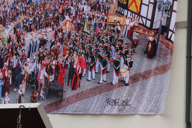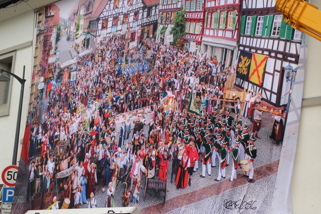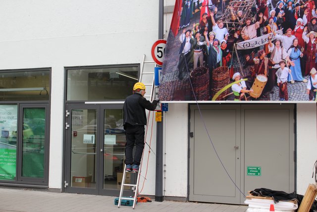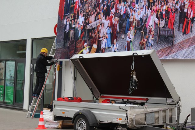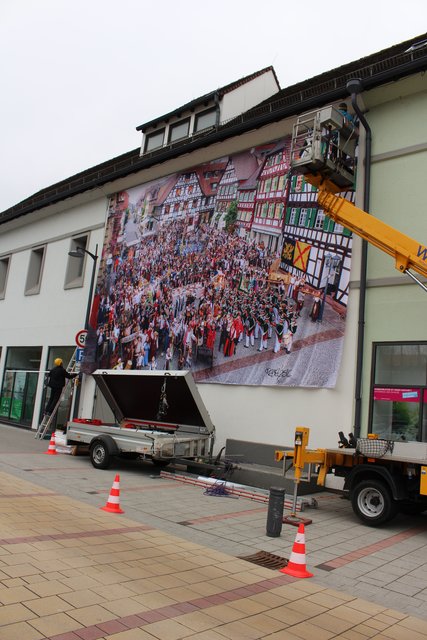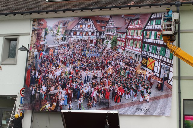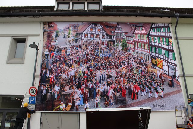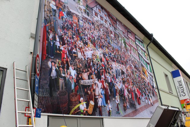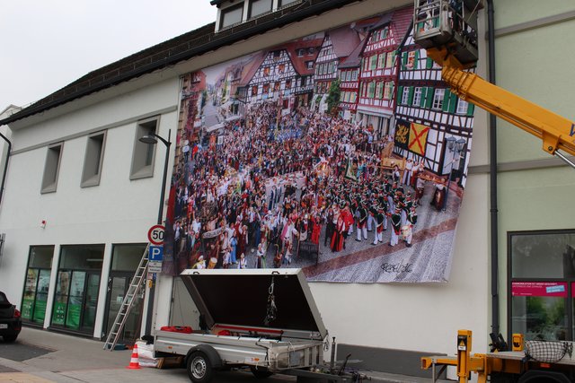 Nachdem bereits am Donnerstag der Brettener Pfeiferturm mit dem Antlitz Luthers verhüllt wurde, hat heute, am 24. März, die Weißhofer Galerie mit dem "Wimmelbild" des Fotografen Thomas Rebel ein neues Gewand bekommen.