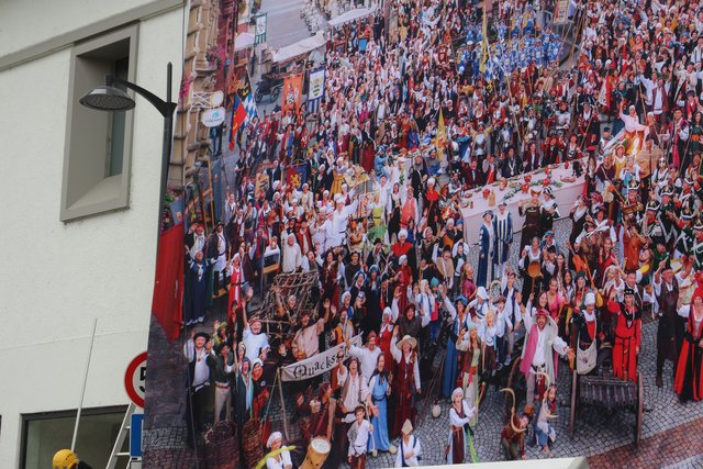 Bretten (hk) Erstaunte Blicke beim Verlassen der Weißhofer Galerie in Richtung der Sporgasse. Von der weißen Rückwand des Gebäudes schauen den vorbeiziehenden Passanten rund 700 Gesichter entgegen. Dort wurde am heutigen Freitag, 24. März, das Bild der Huldigungsszene aus dem Mittelalter, das im September vergangenen Jahres vom Fotografen Thomas Rebel festgehalten wurde, an die Rückwand der Galerie montiert. Die Installation ist Teil der Ausstellung „Dialog, Disput und Erneuerung“, bei der historische Gebäude der Kernstadt mit Werken von Künstler Thomas Rebel verhüllt werden.