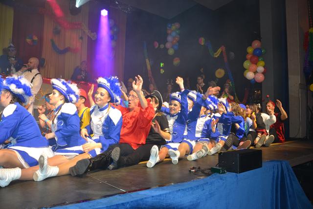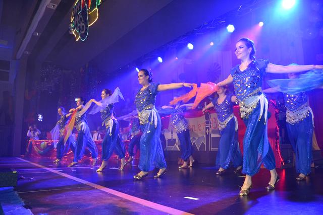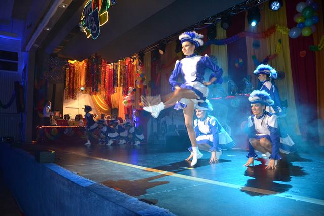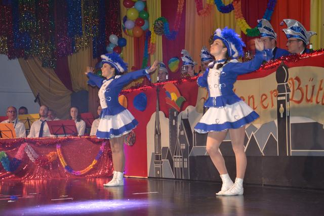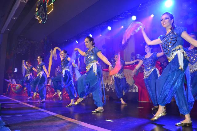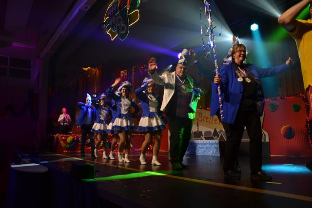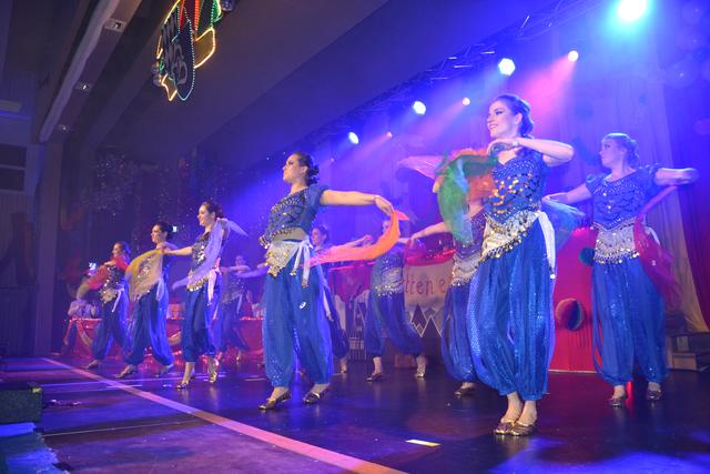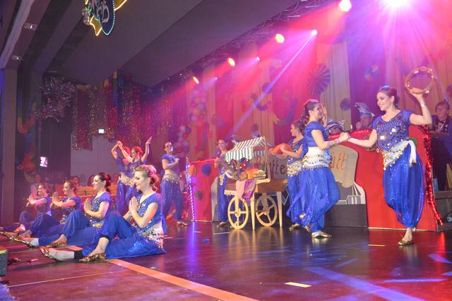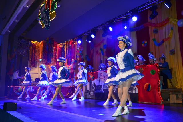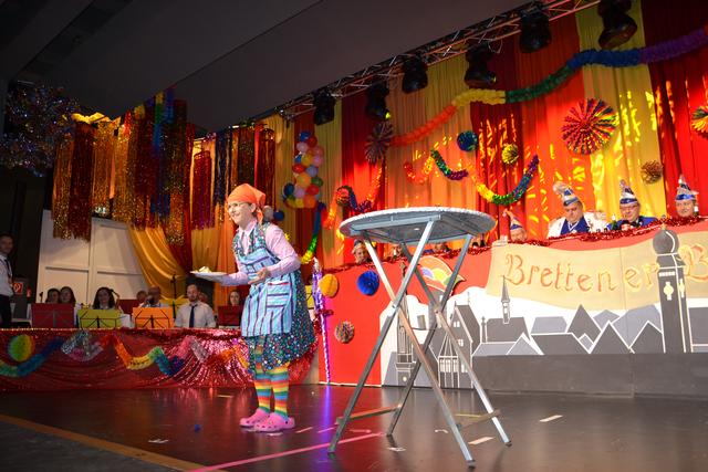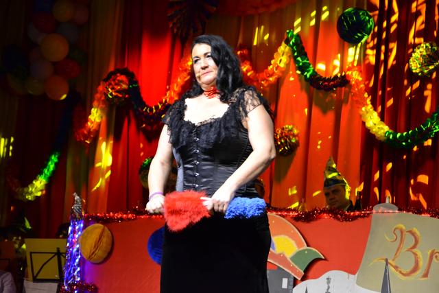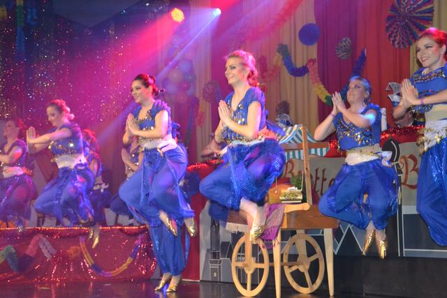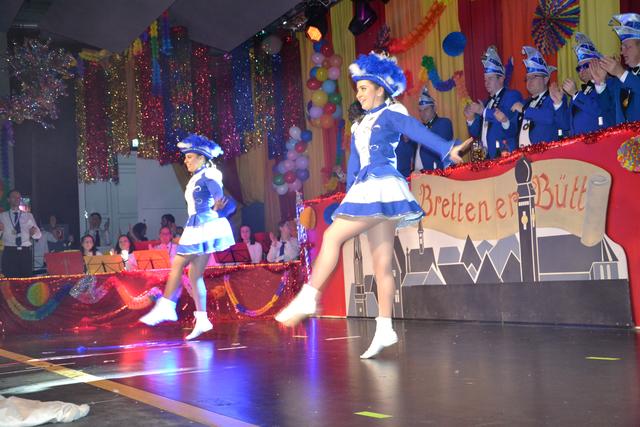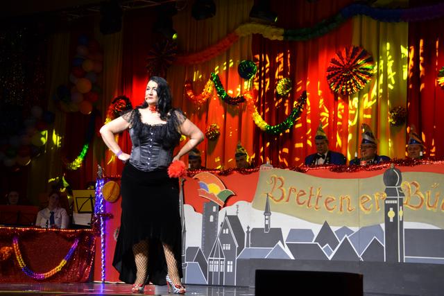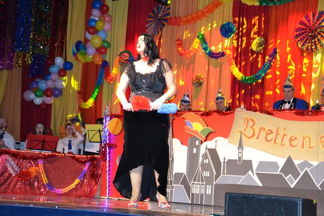 Die Neuzugänge Valle und Wolle von der Post alias Valentin Braun und Wolfgang Wagner besangen auf die Melodie von „Lady in Black“ das Debakel, in dem die deutsche Parteienlandschaft derzeit stecke, und bedachten die Probleme des Öffentlichen Personennahverkehrs mit dem Lied „Auf der Brettemer Eisabahne“. Die Brettener Hofsänger erfreuten mit mehrstimmigem Gesang und das Gardeballett ließ die Beine fliegen. Zauberhaft war vor allem ihr Auftritt in Orient- und Bollywood-Manier. Geradezu akrobatisch zeigten sich die Funkenmariechen Elisa Schnorr und Angelina Cosi-Montes. Als Umschulerin für eine Yoga-Schule der besonderen Art, plauderte Daniela Mößner als Catherine aus dem netzbestrumpften Nähkästchen. „Beeekanntmachungen“ ließ Günther Wolf verlautbaren, zum Beispiel was passiert, wenn man den Magen-Darm-kranken Hund und den Saugroboter allein zu Hause lässt.