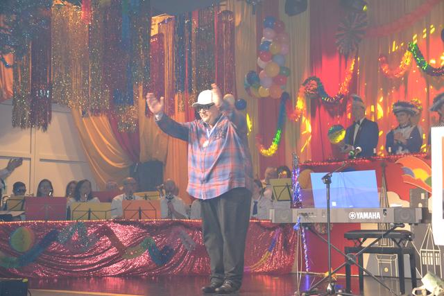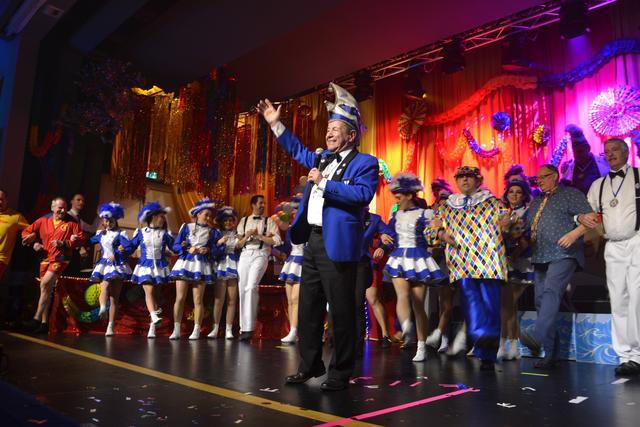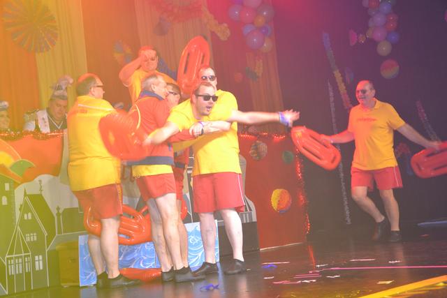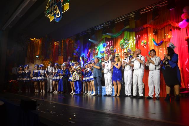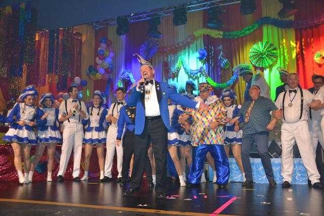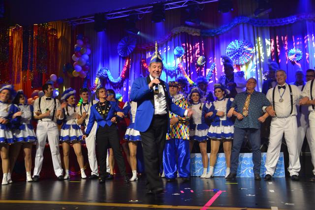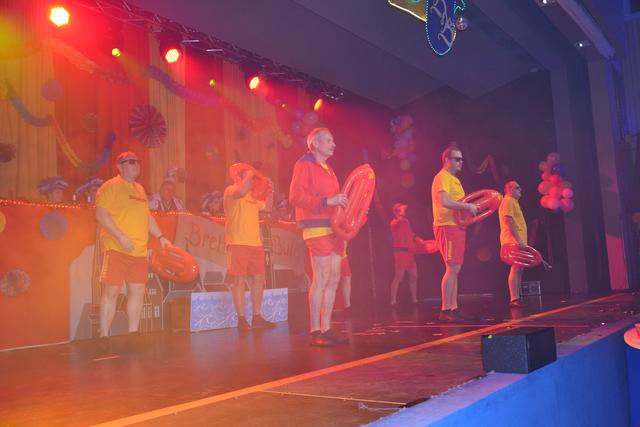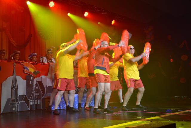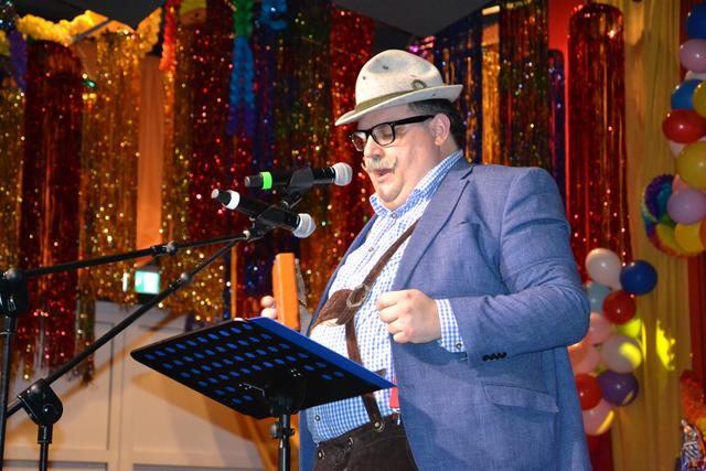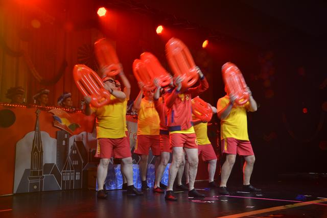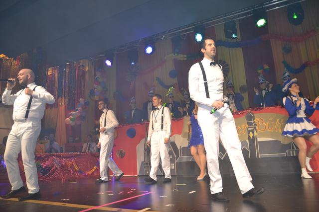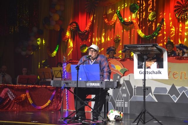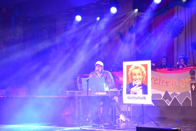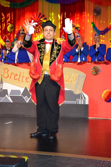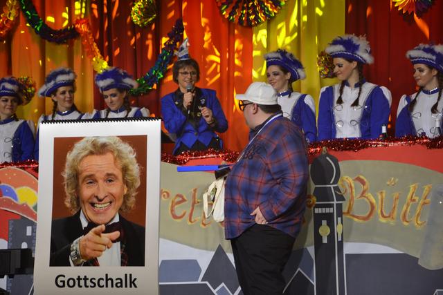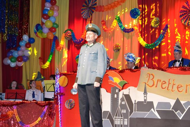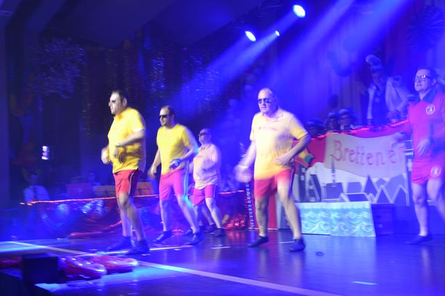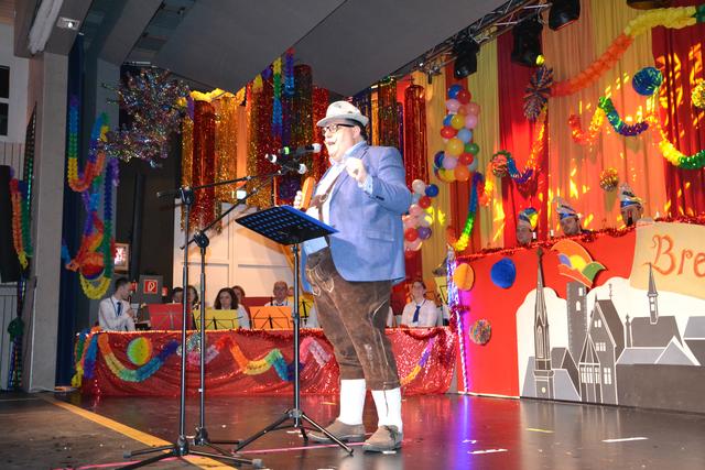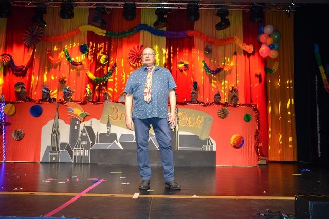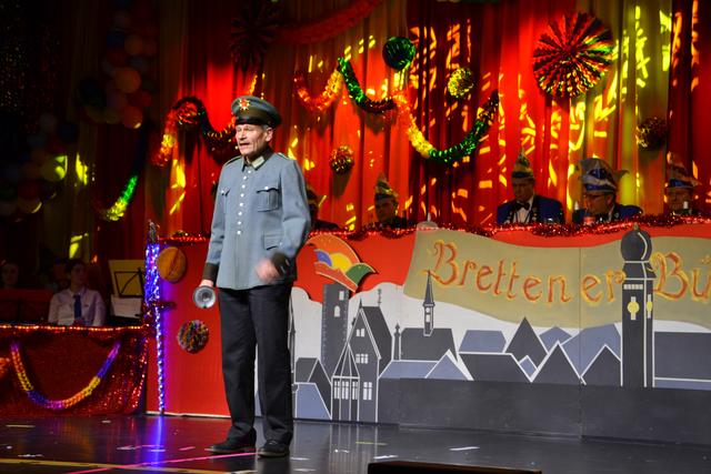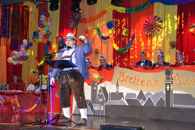 Sitzungspräsident Bernd Neuschl glänzte ebenfalls in seinen Rollen. Als Bayer Herbfried Nudelhuber in Lederhosen und Karohemd brachte er den ganzen Saal zum Jodeln und erinnerte daran, dass es wichtig sei, beim Grillen auf die Temperatur zu achten, denn sonst werde die Thüringer Bratwurst leicht braun. Von der Flop-Akademie Mannheim war Professor Ben Bock nach Bretten gekommen. Auf die Melodie von „El Condor pasa“ thematisierte er, dass bei den Kommunalwahlen viele gedacht hatten, sie würden automatisch Ortsvorsteher. Für reichlich Gelächter und Applaus sorgten auch Neuschls Imitationen von Prominenten wie Gottschalk, Calmund oder Bruce Darnell, die in Louis Armstrongs Lied „What a Wonderful Bütt!“ gipfelten. Der Elferrat tanzte unter Einsatz seiner „Knackärschle“ und „strammer Waden“ noch eine atemberaubende "Barwatch"-Nummer, inklusive Surfbrett, und zum Schluss erklärte Ehrenpräsident Alfred "Fredy" Ersch noch singenderweise, warum es in Bretten so schön ist.