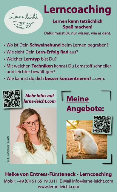 Kürnbach. Leichtes und besseres Lernen in einer immer komplexeren Welt vermittelt Heike von Entress-Fürsteneck. Dabei stehen die Freude am Lernen und die Stärkung der Persönlichkeit im Vordergrund. „Ich gebe Sicherheit und stärke den Selbstwert von Personen in einer sich ständig verändernden Lern- und digitalen Welt“, erläutert die Lerncoachin. Dabei wendet sie sich an alle Altersgruppen, von Schülern über Auszubildende, Studenten, Berufstätige bis zu Senioren. Denn in der neuen digitalen Welt ist es wichtig, für den (Lern-)Druck und den Anspruch „lebenslang zu lernen“ gewappnet zu sein.