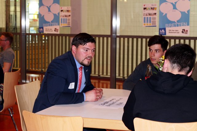 „Warum soll ich Sie wählen?“ Auch diese Frage fiel mehr als einmal im Laufe der Gespräche. Hermann Fülberth von „Aufbruch Bretten“ klärte die Jugendlichen zunächst über einige Unterschiede zwischen einer Partei und einer Wählervereinigung auf. „Die Kosten für Wahlwerbung beispielsweise bringen unsere Mitglieder selbst auf“, sagte Fülberth. Seinem Unmut machte ein Jugendlicher Luft: „Ich finde, der Jugendgemeinderat erhält wenig Beachtung und Unterstützung vom Gemeinderat“. Fülberth ermunterte den Schüler und riet dem Jugendgemeinderat, sich offensiver aufzustellen. Auf die eingangs gestellte Frage antwortete Andreas Kraus von den „aktiven“ mit: „Wir sind Bretten und seinen Bürgern verpflichtet“. „Mir ist aufgefallen, dass ihr viel werbt“, entgegnete ihm ein Schüler, worauf Kraus lachend antwortete: „Damit möchten wir nicht die Chance verpassen, dass uns möglichst viele Bürger kennenlernen.“ Der Lokalpolitiker machte deutlich, dass es ihm besonders am Herzen liege, ein offenes Ohr für die Brettener Jugend zu haben. Im Gespräch mit den Jugendlichen erfuhr er im Übrigen auch, dass Facebook wohl bei der jüngeren Generation immer noch beliebt sei.