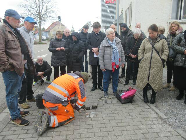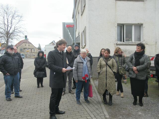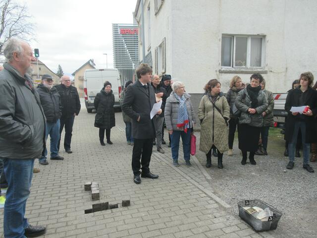 Bretten (ger) „Es wird oft gesagt, dass sich Geschichte wiederholt. Wir wollen alles tun, dass das hier nicht zutrifft.“ Die Aussage eines Schülers der elften Klasse des Melanchthon-Gymnasiums Bretten (MGB) umschreibt den Grund, warum die Beschäftigung mit Geschichte lehrreich und lohnenswert ist. Bei wolkenverhangenem Himmel und stürmischen Böen waren Geschichtsinteressierte, darunter auch einige Besucher aus der Partnerstadt Bellegarde, am Freitag, 17. Februar, zusammengekommen, um dabei zu sein, wie an der Weißhofer Straße 96 fünf Stolpersteine ersetzt wurden.