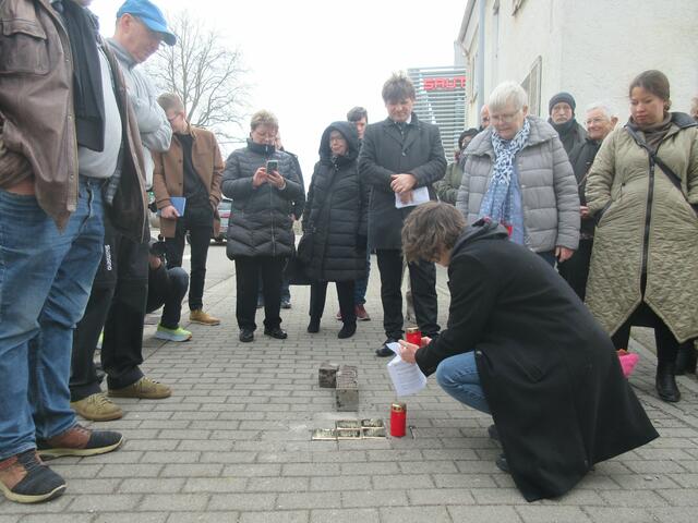 Die alten, in den Gehweg eingelassen Pflastersteine mit den Namen Sigmund, Lina, Anna und Meta Schmulewitz sowie Chil Ignatz Helbarth waren beschädigt worden. Ob dies bei Bauarbeiten oder mutwillig geschehen ist, sei nicht nachzuvollziehen, merkte Bürgermeister Michael Nöltner in seiner Ansprache an. Er dankte Heidi Leins, die in Bretten unermüdlich die Geschichte der jüdischen Familien rekonstruiert, sowie dem Geschichtskurs der Oberstufe des MGB mit den Lehrerinnen Sandra Fichtner und Natalia Lakman. Sie führen die vom ehemaligen MGB-Lehrer Dirk Lundberg begonnene Tradition um die Stolpersteine fort.