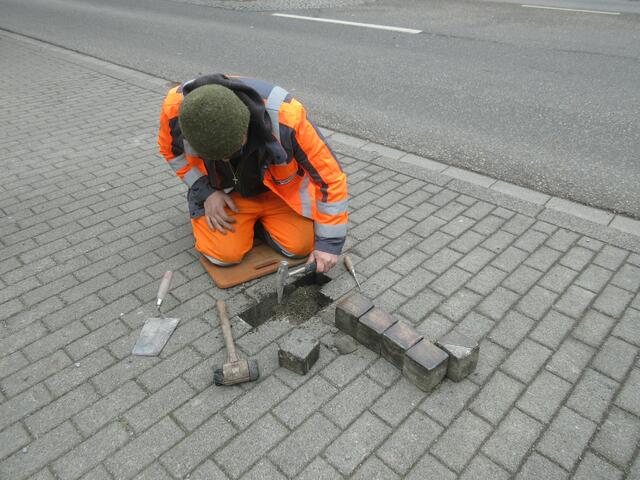 Zum ersten Mal mussten in Bretten nun Steine ersetzt werden. Heidi Leins kümmerte sich diesmal um die Spenden für die neuen Steine. Nachdem Schülerinnen unter der Leitung von Musiklehrerin Ursula Benzing das hebräische Lied „Hi ne mah tov“ intoniert hatten, und Nöltner betont hatte: „Es ist wichtig, dass das Gedenken nicht aufhört!“, verlas die Schülerin Melina Krauß die Geschichte der Familie Schmulewitz. Vater Sigmund Schmulewitz war Inhaber einer kleinen Schuhfabrik mit mehreren Angestellten. Das Schicksal der Familie können Sie hier nachlesen. Währenddessen verlegte ein Mitarbeiter des Bauhofs die neuen Steine.