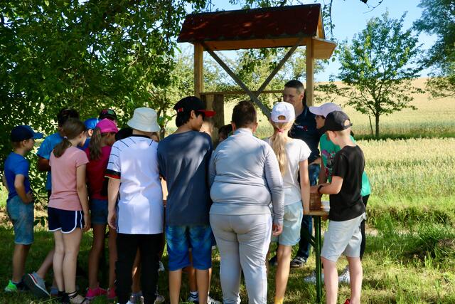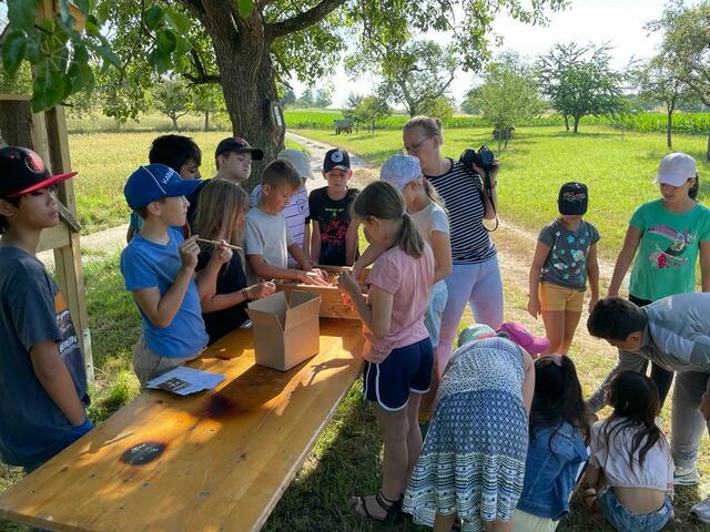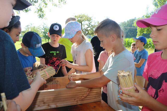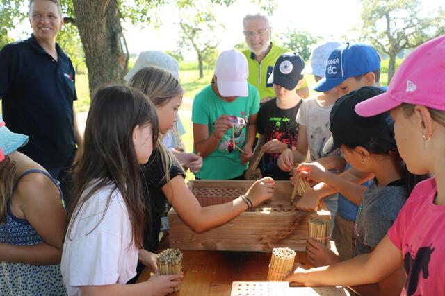 Bretten-Rinklingen (lv) Der OGV Rinklingen organisierte für die vierte Klasse der Grundschule Rinklingen ein wundervolles Naturspektakel: Den Bau eines Insektenhotels unter freiem Himmel, mitten auf den Rinklinger Feldern entlang des Rinklinger Rundwanderweges. Am Donnerstag, 23. Juni, besuchte die vierte Klasse das vom OGV gepflegte Insektenhotel. Das Bauen und Anbringen von Wildbienen-Nisthilfen dient dem Artenschutz und eignet sich hervorragend, um Kinder mit der heimischen Tierwelt und ihren Eigenschaften vertraut zu machen. So ist es beim OGV Rinklingen schon Tradition, jedes Jahr aufs Neue mit der Grundschule Rinklingen solch ein Abenteuer durchzuführen.