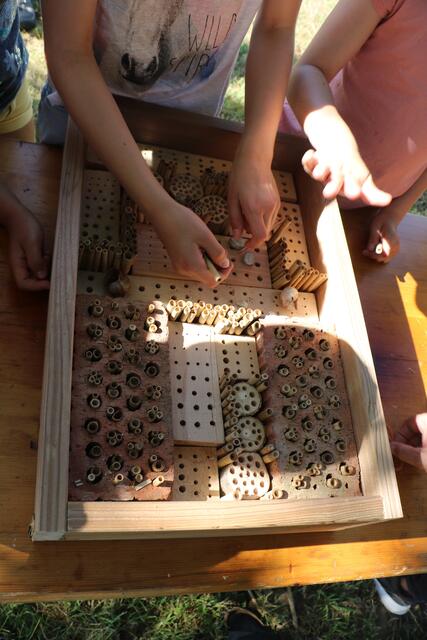 Nachdem dann die Kinder vor Ort das Insektenhotel mit Material wie Schilf und Hölzer gefüllt hatten, wurde die Fertigstellung des Projekts mit Erfrischungen und einer kleinen Stärkung belohnt: Ursula Kößler, Beisitzerin des OGV Vorstandsteams, bereitete für alle Kinder leckere Gemüsesticks, belegte Brötchen und frische Apfelschnitze vor. Am Ende dieses Erlebnisses hatten die Kinder noch genug Zeit, um sich vor Ort in freier Natur auszutoben, auf die Bäume zu klettern oder mit dem kleinen Hund des Vorstands zu spielen. Pünktlich zum Religionsunterricht war die Klasse dann auch wieder zurück an der Grundschule. „Die stolzen Gesichter von Kindern sind der Lohn, wenn man mit ihnen und unter Anleitung des OGV eine Wildbienen-Nisthilfe bastelt“, fasste Klassenlehrerin Meyer den Tag zufrieden zusammen.