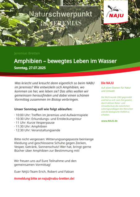 Am Sonntag den 27.07. um 10Uhr findet die NAJU Expedition in den Jeremias des NABU statt.