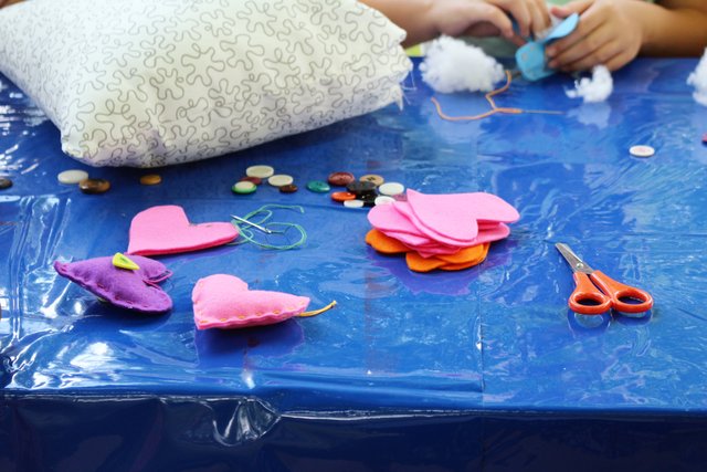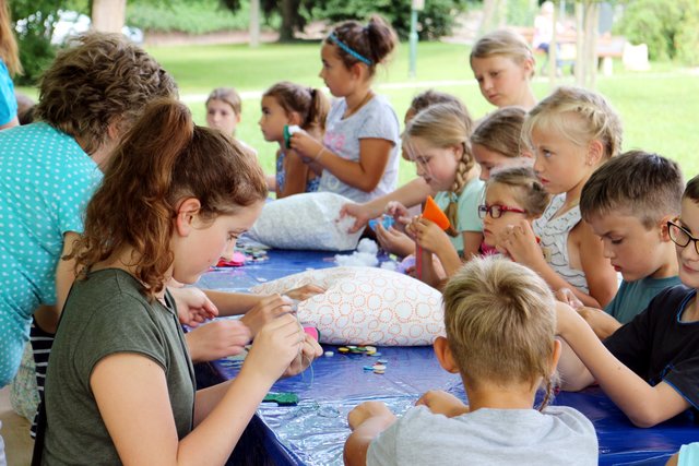 Bretten (hk) "Hui, das ist aber toll!", sagte Christina Exner mit einem strahlenden Lächeln. Im Rahmen der "Sommer im Park"-Veranstaltungsreihe bastelte sie am Mittwoch, 16. August, mit rund 20 Kindern unter den schattenspendenden Bäumen des Stadtparks sommerliche Anhänger aus Filz, verziert und geschmückt mit Bändern, Borten, Knöpfen und Perlen. Stich für Stich und konzentriert arbeiteten die kleinen Nähkünstler, um im Anschluss die Anhänger mit nach Hause nehmen zu dürfen.