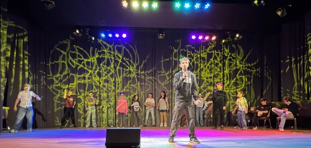 zeigten vier Künstler*innen, wie krass sie rappen können. Dass dabei Jugendsprache zur Anwendung kam, sorgte für einen zusätzlichen Reiz. Für die angemessene Setzung der Lightshow war die AG Veranstaltungstechnik zuständig. Tobias Block und Peter Kornblum hatten sich in den zahlreichen Proben, die sie vor allem gegen Ende der Probenzeit besuchten, akribisch darauf vorbereitet, die Lichttechnik in der Aula professionell in Szene zu setzen.