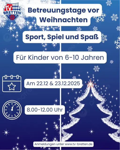 Der Turnverein Bretten bietet kurz vor Weihnachten eine besondere Ferienbetreuung für Grundschulkinder an. Am 22. und 23. Dezember findet jeweils von 8 bis 12 Uhr ein sportlich abwechslungsreiches Programm für Kinder der ersten bis vierten Klasse statt. Die Vormittage stehen ganz im Zeichen von Bewegung, Spiel und Spaß. Nach einer freien Bringzeit von 8 bis 9 Uhr beginnt der Tag mit einem gemeinsamen Frühstück. Anschließend erwartet die Kinder in der Sporthalle ein buntes Programm mit Spielen, kleinen Wettbewerben und sportlichen Aktivitäten. Um 12 Uhr endet die Betreuung mit der Abholzeit. Ziel des Angebots ist es, den Kindern kurz vor den Feiertagen noch einmal Bewegung, Gemeinschaft und Freude zu ermöglichen.