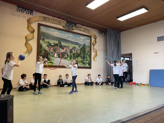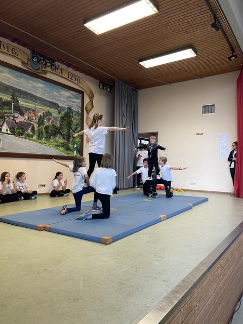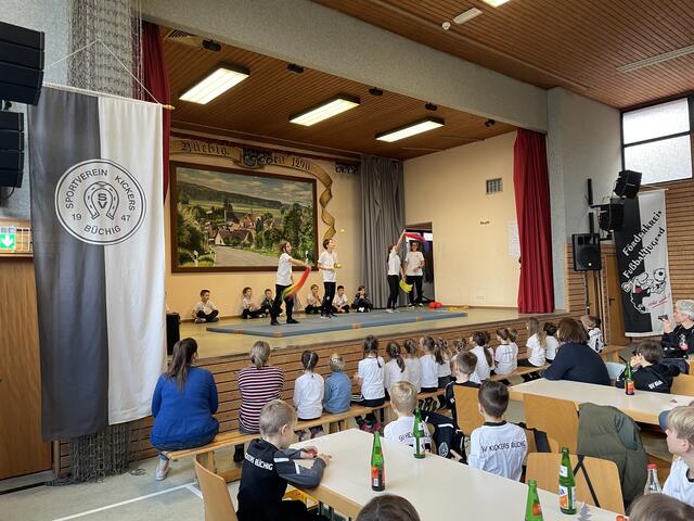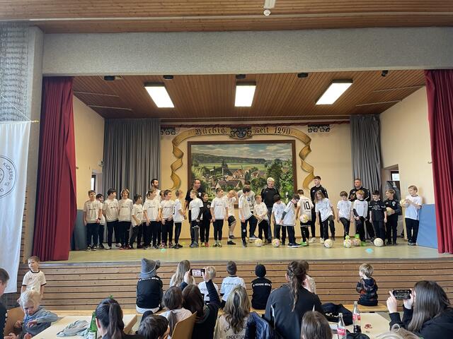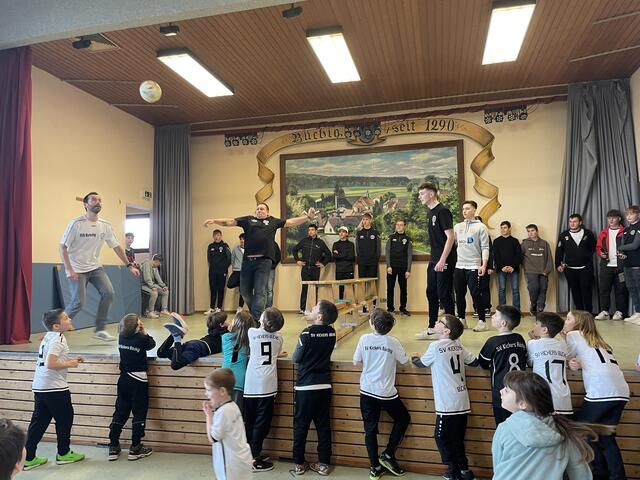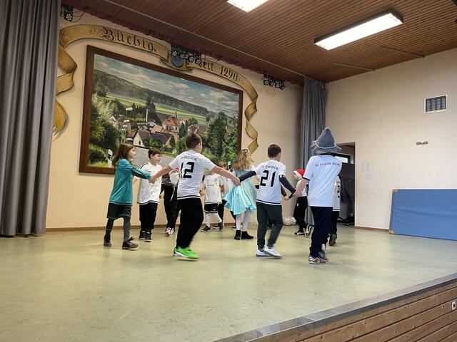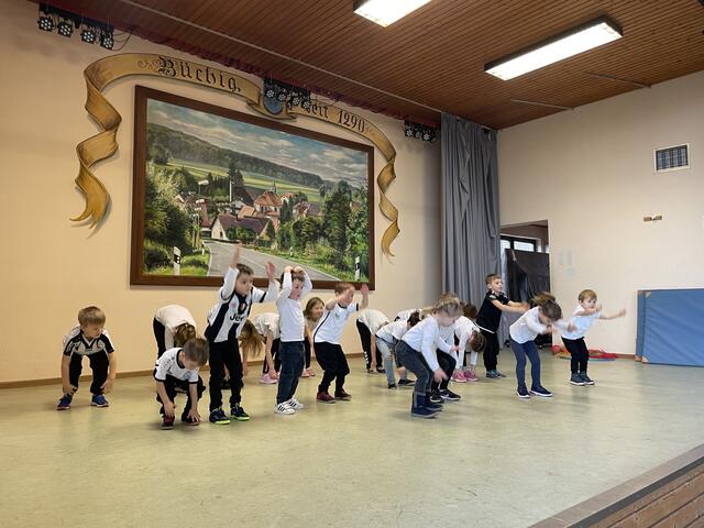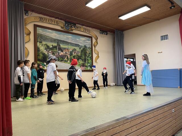 Anschließend ging es Schlag auf Schlag mit den Programmpunkten los. Mit zwei Kinderturngruppen startete Corinna Kernwein das Programm. Die jüngeren Turnkinder zeigten zuerst mit Musik untermalte spielerische Bewegungs- und Turnübungen. Danach zeigte der jugendliche Turnernachwuchs zu aktuellen Beats ihr Können. Kernwein bedankte sich bei Ihren Helferinnen, ohne die eine Betreuung der über 40 Kinder nicht möglich wäre. Kaum war die Bühne leer, zogen die F-Junioren mit Verstärkung durch die Bambinis als Zwerge in die Halle ein. Geschicklichkeitsübungen mit dem Ball wurden in das Märchen von Schneewittchen und die sieben Zwerge eingebaut.