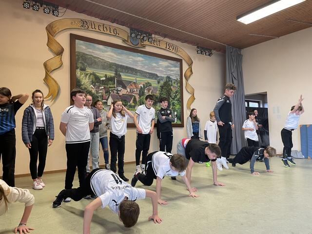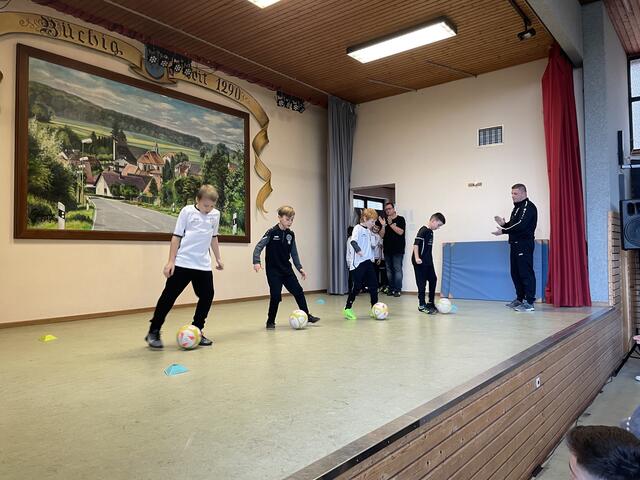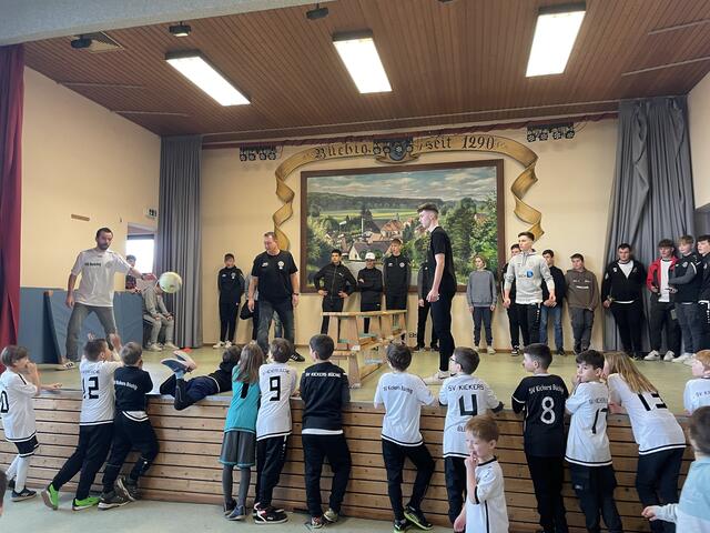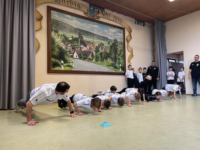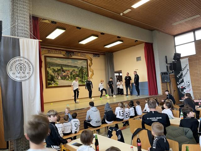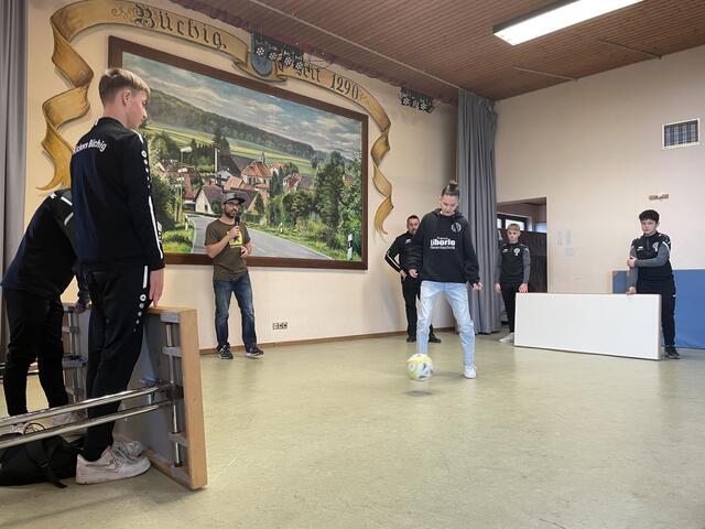 Kraftvoll stellten anschließend die E-Junioren ihre Fitness zu Klängen von AC/DC’s Lied TNT zur Schau. Vom Aufwärmen über Liegestütze bis zum Können am Ball wurde das Publikum begeistert. Bei den D-Junioren waren Spieler aus den anderen Mannschaften gefordert. Innerhalb eines Zeitfensters von drei Minuten musste der Ball möglichst oft abwechselnd links und rechts an die Bande gespielt werden um die Siegermannschaft zu ermitteln. Ein kleines Fußballtennis-Turnier wurde durch die C-Junioren organisiert. Zwei Mannschaften mit Spielern und zwei mit Trainern traten gegeneinander ein. Ein Können war den Spielern nicht abzusprechen, gleichwohl flog mancher Ball ins Publikum. Zuletzt ging es nochmals an die Kondition. Auch die C-Juniorinnen veranstalteten einen Wettbewerb, bei denen konditionell gute Spieler aus den Mannschaften mit Liegestützen und Strecksprüngen ihre Kondition unter Beweis stellten.