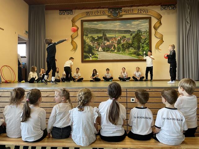 Bretten-Büchig (ur) Zwerge, sportliche Geschicklichkeit, viel Beifall und noch einiges mehr gab es am Samstagnachmittag bei den Büchiger Kickern. Der SV Kickers Büchig veranstaltete mit Unterstützung vom Förderkreis Fußballjugend des Vereins seine Jugendwinterfeier und somit standen die Nachwuchskicker und Turnkinder den ganzen Samstagnachmittag im Mittelpunkt. Jede Gruppe trug mit einem Beitrag zum Gelingen der Veranstaltung bei. Vom Einmarsch der Zwerge bis zur Geschicklichkeit mit dem Fußball boten die Darstellungen ein abwechslungsreiches und buntes Programm. Auch für das leibliche Wohl war gesorgt. Nach über vier Stunden abwechslungsreichem und kurzweiligem Programm und einem Gruppenbild mit dem SVB-Nachwuchs konnte sich SVB Jugendleiter Baberske bei allen Mitwirkenden für den gelungenen Nachmittag bedanken.