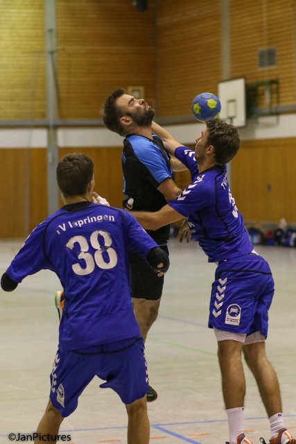 • Am Ball Johannes Kößler vom TV Gondelsheim links die Nr. 30 Marvin Dehm und rechts die Nr. 3 Axel Müller beide TV Ispringen 2