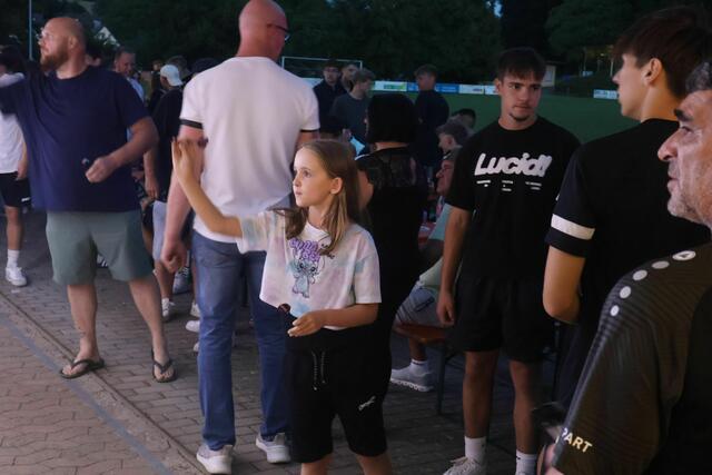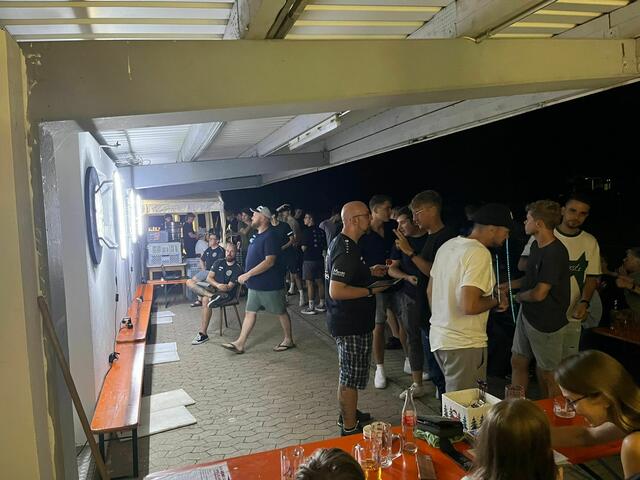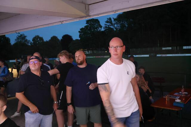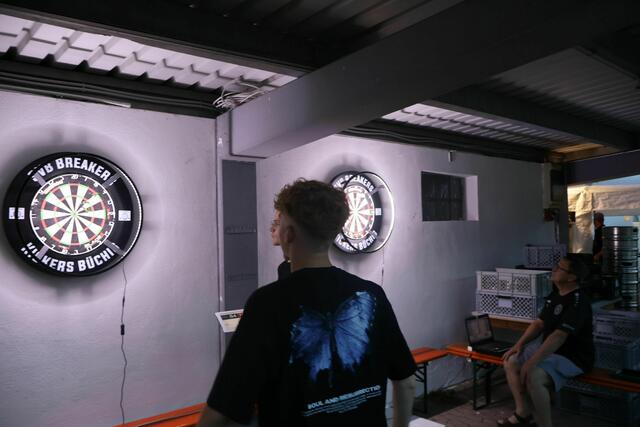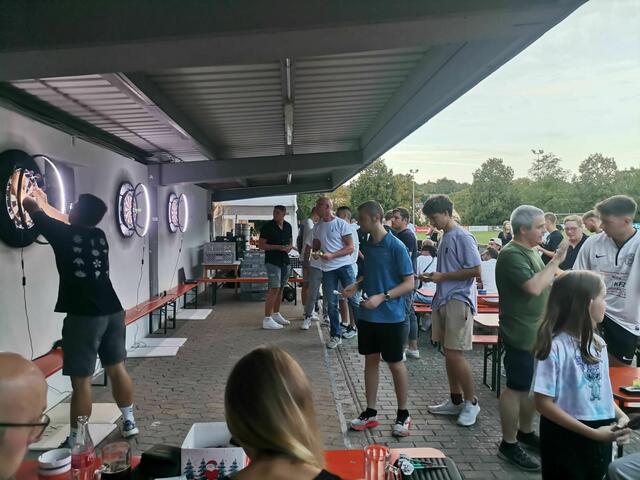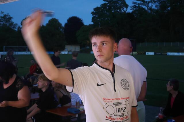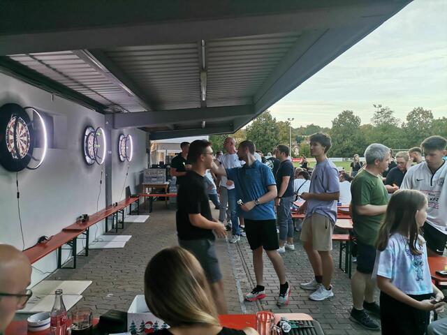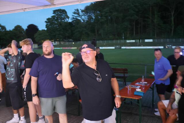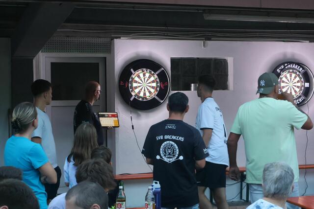 Nachdem der U14-REWE CUP tagsüber den Samstag mit Fußball dominierte sollte im Rahmen der Planungen des Sportfestes am Abend thematisch etwas anderes auf der Agenda stehen. Die Verantwortlichen der vereinseigenen Dartgruppe war sofort bereit, ein Dartturnier zu organisieren. Nachdem final zwölf Anmeldungen mit je vier Personen vorlagen, hat sich dieses Experiment gelohnt. Das sommerliche Wetter und der laue Sommerabend machten der Planung keinen Strich durch die Rechnung und das Turnier konnte nach der Siegerehrung des U14-REWE CUPs planmäßig starten. Die Mannschaften setzten sich überwiegend aus Fußballspielern und -spielerinnen und Mitgliedern des SVB sowie Familienmitgliedern inklusive deren Freunde und Freundinnen zusammen. Eine besonderes Highlight war für die Verantwortlichen, dass auch zwei Trainerteams der Fußballmannschaften vom U14-REWE CUP zum Start begrüßt werden konnten. Zum einen waren es die Trainer vom Team des FSV Mainz 05 und zum anderen vom Team des FC Augsburg. Diese fühlten sich augenscheinlich im Kreise der Einheimischen und Turniergastgeber sichtlich zuhause.