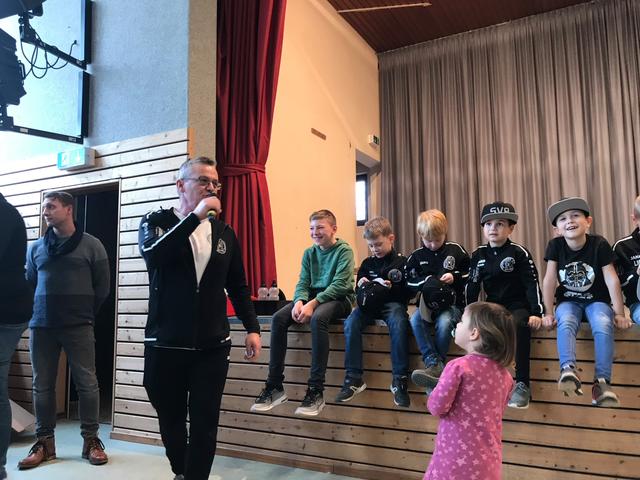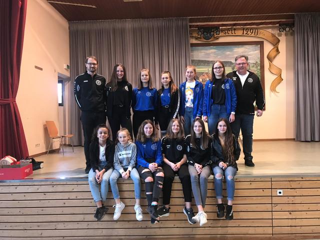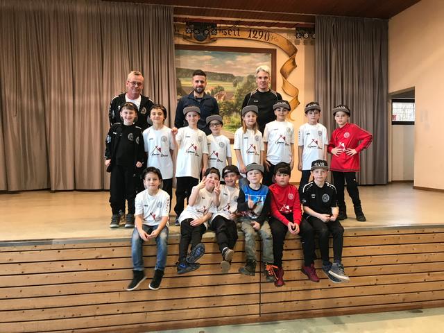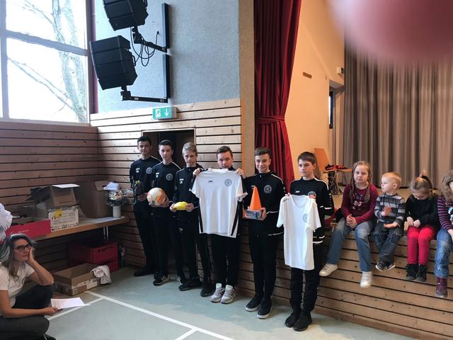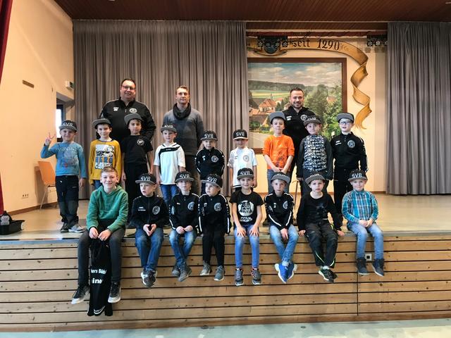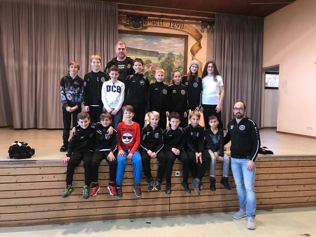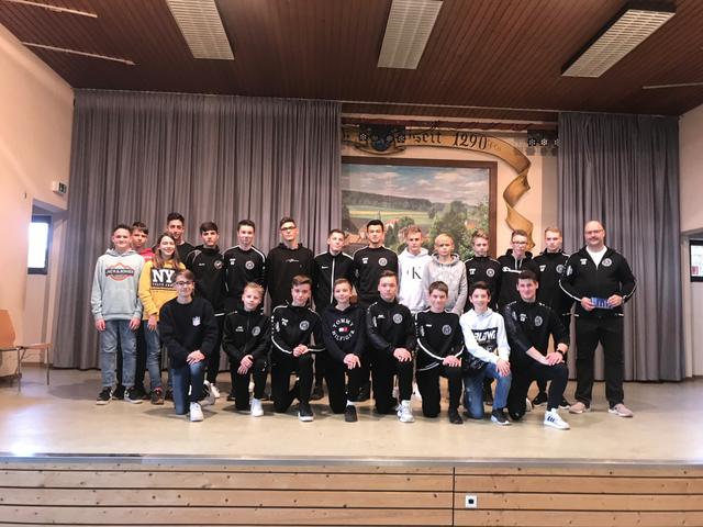 In den Vereinsfarben schwarz und weiß gab es dann noch Geschenke für die Kinder und Jugendlichen. Je nachdem was die einzelnen Mannschaften sinnvoll für den Spiel- oder Trainingsbetrieb benötigten, gab es für die Turnkinder, Spielerinnen und Spieler Trikots, Funktionsunterhemden, Aufwärmshirts oder Schildmützen. Mit einem Gruppenfoto und dem herzlichen Dank an alle Trainer und Helfer im Jugendbereich wurde die Winterfeier beschlossen.