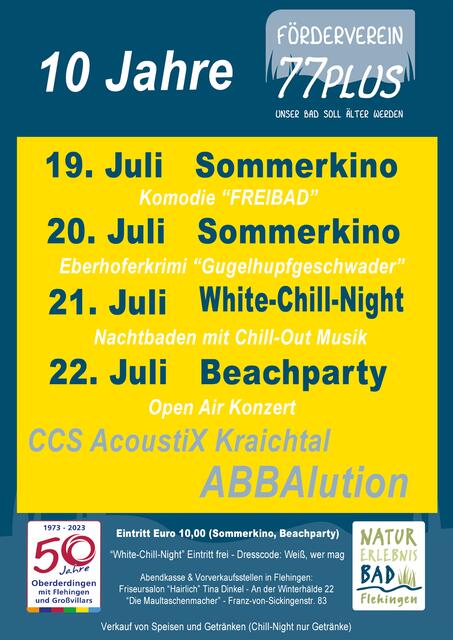 Feier mit uns das 10-jährige Bestehen des Schwimmbad Födervereins „77plus – unser Bad soll älter werden“. Die Vocal Group CCS AcoustiX aus Kraichtal eröffnet die Open Air Session mit Songs von Johnny Cash bis Pink. CCS-AcoustiX besteht aus drei Musikern, die Ihre Bühnenerfahrung als Mitglieder verschiedener regionaler Coverbands über Jahre sammelten. CCS besticht durch leisere Töne, was der Dynamik des Repertoires keinen Abbruch tut. Ein Schwerpunkt der Gruppe liegt auf dem Gesang. Die vielseitigen Powerstimmen garantieren Gänsehautfeeling. Als Bühnen Highlight heizt Euch die ABBA Coverband ABBAlution mit alten und neuen Hits so richtig ein. ABBAlution präsentiert selbstverständlich alle wichtigen Songs, von "Mamma Mia" und "Dancing Queen" über "Souper Trouper", "The winner takes it all", "Fernando" bis hin zu "Thank you for the music", da glänzen die Augen der Fans! Um den Zauber ABBA auf die Bühne zu bringen braucht es professionelle Musiker und Sängerinnen, die perfekt aber auch mit eigener Note den zweifellos unnachahmlichen Sound in Live-Feeling verwandeln. ABBAlution macht genau das mit Begeisterung und Hingabe!
