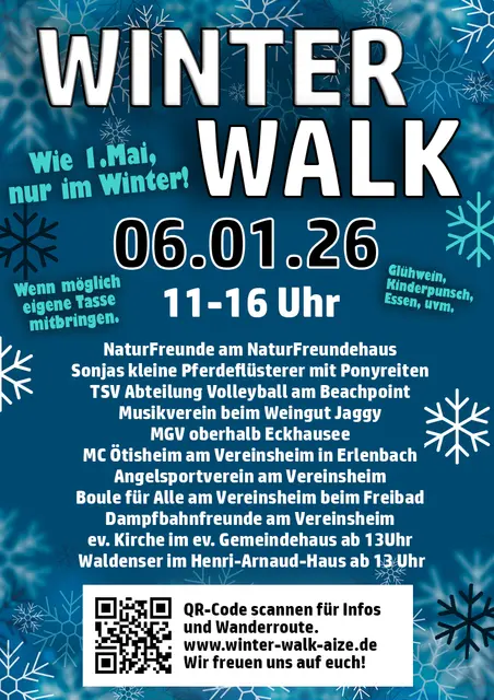 Im Jahr 2023 auf Initiative der NaturFreunde ins Leben gerufen, wurde der Winter Walk auf Anhieb zum Erfolg. Grund genug für die Organisatoren, die beliebte Veranstaltung auch zu Beginn des neuen Jahres wieder durchzuführen. Am 6.1.2026, dem Dreikönigstag, steht somit der vierte Aizemer Winter Walk an, der wieder eine hervorragende Gelegenheit bietet, nach den Festtagen an der frischen Winterluft entspannt mit der Familie oder Freunden spazieren zu gehen und in geselliger Runde das eine oder andere leckere Angebot an unterschiedlichen Stationen zu genießen.