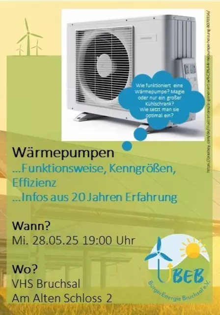 Wie funktioniert eine Wärmepumpe? Was muss ich beim Kauf beachten? Welche Kenngrößen kann ich vergleichen? Welche Fördermöglichkeiten gibt es? Und wie kann ich meine Energiekosten senken? Der ideale Vortrag für alle Häuslebesitzer und alle, die es werden wollen!