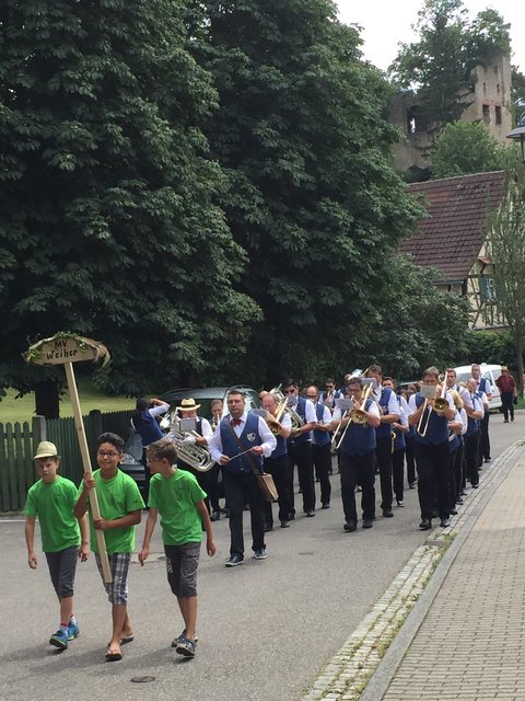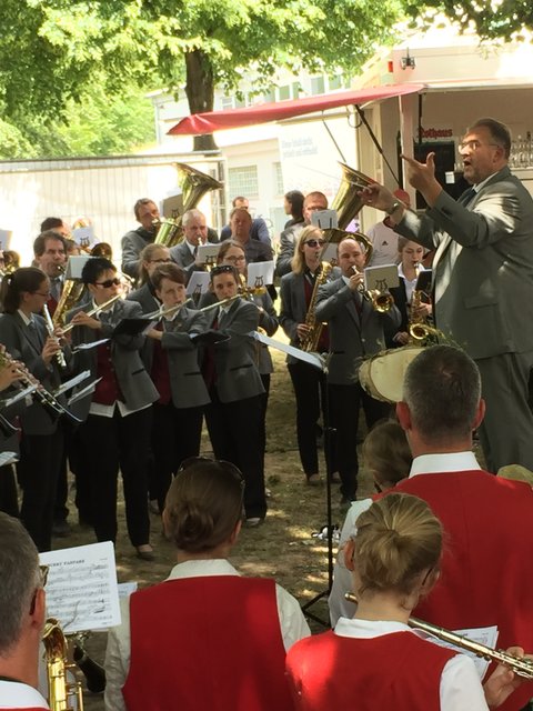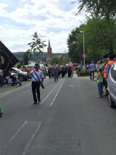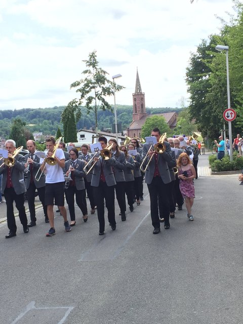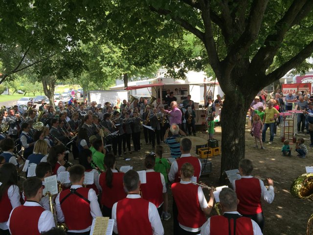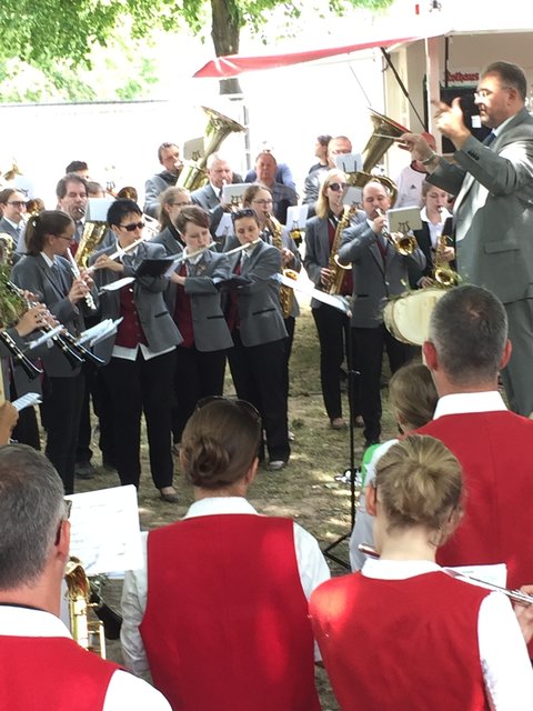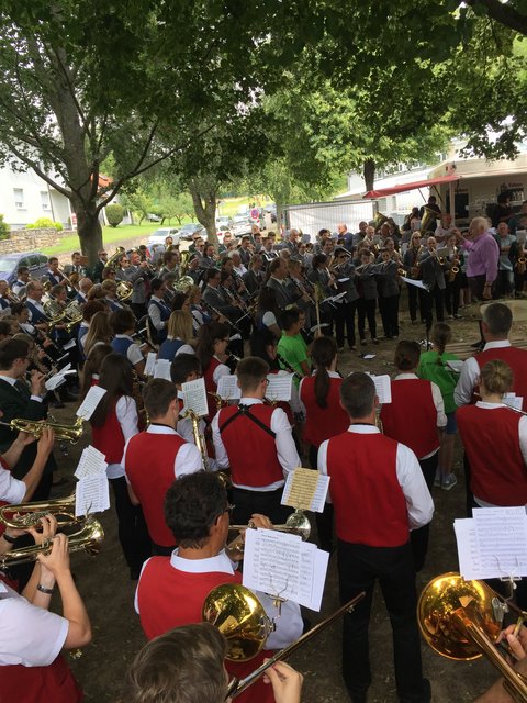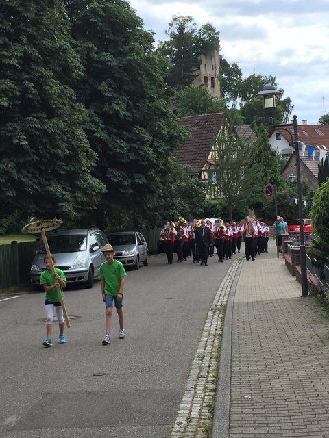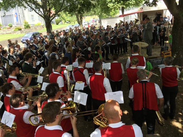 Mit einem sogenannten Sternmarsch unterhielten am vergangenen Sonntag vier Musikvereine anlässlich des 125jährigen Jubiläums des Musikvereins Eintracht Obergrombach e.V. den schönsten Stadtteil Bruchsals. Von zwei Startpunkten aus zogen die Musikvereine aus Odenheim, Untergrombach, Weiher und der Jubiläumsverein aus Obergrombach in das Dorf ein und trafen sich auf dem Festplatz. Mit über 150 Musikern wurden dann die Stücke Concert Fanfare und Apertum, geleitet von MVO Dirigent Uwe Hirschgänger, den Gästen und Freunden der Blasmusik vorgetragen. Ehrendirigent Siegfried Lepp, der von 1973 bis 1998 beim MVO dirigierte, übernahm für das letzte Stück, dem Hoch Badnerland, den Dirigentenstab und sorgte damit für einen denkwürdigen Abschluss des Marsches. Bei herrlichem Sonnenschein erfreuten sich die Gäste und auch die Anwohner in den Straßen über dieses außergewöhnliche Konzert. Schon vor dem Festbeginn wurden die Ortsfahnen zu Ehren des Jubiläums an den Häusern angebracht. „Eine besondere Ehre, die wir sehr zu schätzen wissen und die uns außerordentlich freut,“ so Rolf Janzer, 1. Vorsitzender. „Auch dass unsere befreundeten Musikvereine zu unserem Fest da sind und für wunderbare Unterhaltung sorgen, ist eine tolle Anerkennung." Am Morgen startete das Fest mit dem Comedian Berhane Berhane, dessen Talent vom Mannheimer Kollegen Bülent Ceylan entdeckt wurde. Zur Mittagszeit spielte der Musikverein Büchenau auf. Landtagsabgeordneter Uli Hockenberger hatte sich auch auf den Weg nach Obergrombach gemacht und genoss sichtlich das Programm.