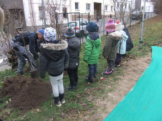 Geliefert wurden die Bäume Ende November. Mitte Dezember war es dann soweit. Der neue Baum wurde von zwei Mitgliedern unter genauer Beobachtung einer kleinen Gruppe von Kindern, die zusammen mit ihren Erzieherinnen und der Leiterin der Kita, Braun-Eckhardt, gekommen waren, auf dem Kindergartengelände gepflanzt. Den Kindern wurden die einzelnen Arbeitsschritte in kindgerechter Form erklärt. So wurden sie in die Aktivitäten mit eingebunden. Eine Mithilfe der Kinder war aufgrund der Abstandsregelungen leider nicht möglich. Dennoch waren diese mit großer Begeisterung bei der Sache und beobachteten interessiert, was da beim Pflanzen des Baumes alles passiert. Schließlich bekam der Baum noch eine Stütze und mit dem Pflanzschnitt endete die Pflanzaktion.