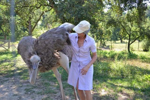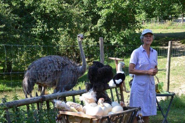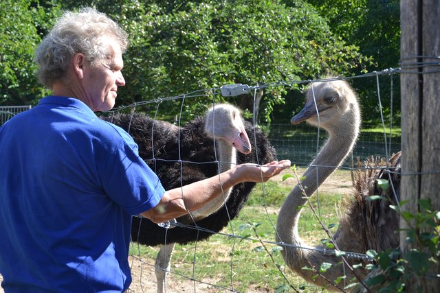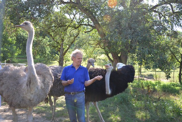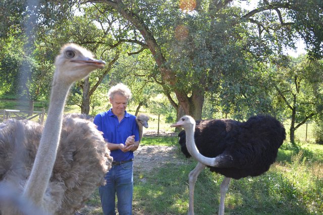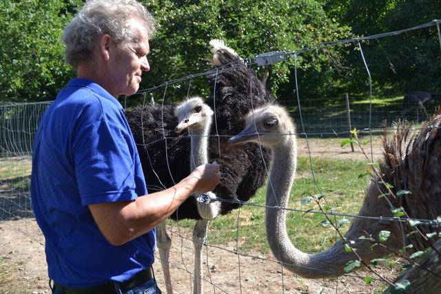 Während Ehemann Peter Herrmann die Strauße hinterm Zaun mit Leckerlis füttert, erzählt seine Frau, wie sie 2011 den Hof als Altersruhesitz gekauft haben und sich die Frage stellten, wie sie die 13 Hektar abweiden sollen. Wie die beiden ersten Strauße, Winnie und Nelson, bei ihnen einzogen, und dass Strauße ideale Weidetiere sind, die sie nur deshalb mit „Straußenmüsli“ zufüttern, damit sie zu den Herrmanns Vertrauen haben. In der Zwischenzeit haben die Herrmanns 13 Strauße. Die beiden Herden werden von je einem Hahn angeführt. Der entscheidet übrigens auch, wann gebrütet wird, indem er die erste Nachtschicht auf der Erdkuhle macht, in die seine Hennen über mehrere Tage ihre Eier gelegt haben. Danach lässt er sich aber gerne von den Damen ablösen.