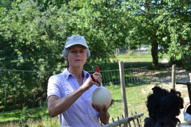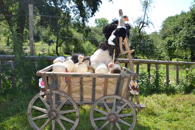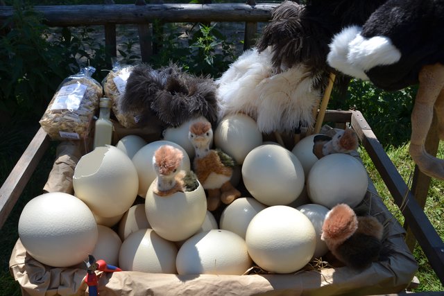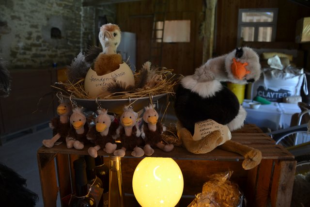 Und die Eier sind das, womit die Herrmanns handeln. Straußenfleisch sei zwar sehr gesund und lecker, vergleichbar mit Rindfleisch, aber sie brächten es einfach nicht übers Herz, die Tiere zu schlachten. So kann man auf dem Hof die großen, etwa 1600 g schweren Eier erwerben, die medikamentenfrei und allergikerverträglich sind. Ein Ei entspricht ungefähr 30 Hühnereiern. Kaufen kann man im Hofladen auch Nudeln aus Straußenei, die in der Bäckerei Kößler in Sternenfels handgewalzt werden, selbstgemachten Eierlikör oder Staubwedel aus Straußenfedern. Letztere sind vor allem für faule Hausfrauen geeignet. „Damit ist man beim Abstauben nämlich schnell fertig“, schmunzelt Corinna Herrmann.
