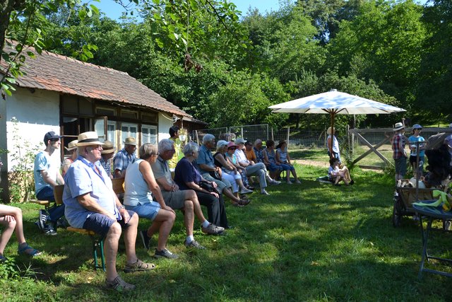 Bruchsal-Helmsheim (ger) „Der Strauß hat eigentlich einen ähnlichen Körperbau wie wir Menschen“, ruft Corinna Herrmann und geht mit vornübergebeugtem Oberkörper in die Hocke. „Allerdings läuft er auf den Zehenspitzen. Daher ist das Gelenk hier nicht sein Knie, sondern seine Ferse.“ Die schlanke Inhaberin des Straußenhofs Gottesau in Bruchsal-Helmsheim macht mit vollem Körpereinsatz vor, wie die riesigen Laufvögel anatomisch aufgebaut sind. Hahn Franz-Josef und zwei seiner Hennen, Luise und Uschi, schauen ihr neugierig zu und auch die 25 Leser und Leserinnen der Brettener Woche/Kraichgauer Bote, die an der Ferienaktion teilnehmen, sind ganz bei der Sache. Vom „Kopf in den Sand stecken“ ist bei den übermannshohen Tieren übrigens keine Spur. Sie nehmen höchstens mal ein erfrischendes Bad im selbigen.