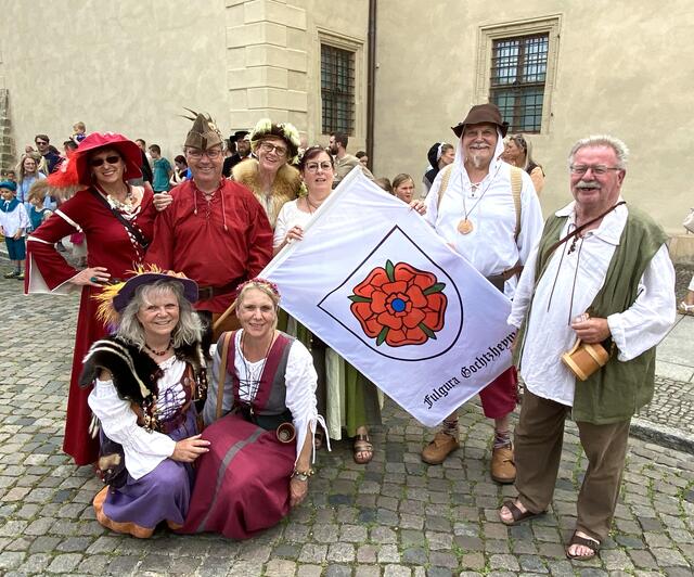 Petrus hatte die Feierlichkeiten zu Luthers Hochzeit 2022 persönlich in seine Obhut genommen und so war das Festwochenende mit Sonne pur gesegnet. Weitgereiste Händler und Wirte erwarteten die Gäste in der Altstadt mit ihren Waren. Die historischen Lager der Landsknechte, Bauern, Stadtwache, Botenläufern, Fanfarenzüge und des Kurfürsten waren um die Originalschauplätze der Reformation wie die Stadt- und die Schlosskirche aufgebaut. Aus vielen Höfen tönten die Klänge der Musikanten und Gaukler. Die Abordnung der Fulgura war ein Teil dieses bunten Treibens und erntete viel „Jubel“ und „Händegeklapper“. Nach dem großen Festumzug am Samstagnachmittag stand der Empfang im Fürstenzelt auf dem Programm. Neben der „Eberstein Ballade“ erzählte die Gruppe mit ihren Liedern von der einfachen Derbheit des geplagten Landvolkes, vom „Fressen und Saufen“ und von der frivolen Leibeslust. Die Erzählungen über das Aufrührerische der Bauern und der Verwegenheit der Landsknechte machten den Kurfürsten etwas nachdenklich, was ihn jedoch nicht davon abhielt die Gruppe für eine Wiederkehr im kommenden Jahr einzuladen.