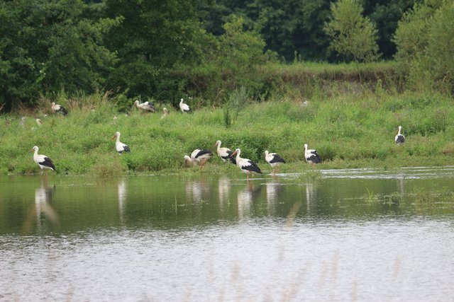 Heute hat sich der Bestand erholt: In großen Gruppen versammeln sich die Großvögel auf den Saalbachwiesen. Bis zu 300 Tiere auf einmal habe man bereits gezählt. Der Dauerregen der letzten Tage hat für einen reich gedeckten Tisch gesorgt. Etwa zwei Stunden lang wanderte die Gruppe mit Fernglas und Kamera ausgestattet über die Wiesenlandschaft. Dabei hatte sie sogar besonderes Glück und konnte einen der seltenen Schwarzstörche beobachten.