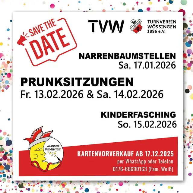 Die Vorweihnachtszeit ist in vollem Gange: Glühwein sprudelt aus mannigfaltigen Quellen, Logistikdienstleister, vollbeladen mit Input für die Bescherung frequentieren die innerdeutschen Highways hart und die besinnlichen Tage winken schon frivol am Horizont. Und da es hinter dem Horizont bekanntlich weiter geht wartet dort geduldig aber eskalationsbereit die 5. Jahreszeit mit tonnenweise Konfetti und guter Laune. Für die Wössinger Mondspritzer heißt es zum mittlerweile 57. Mal: „Allen wohl und niemand weh, Fasenacht beim TVW!“ Kompetent wie wir sind, haben wir euch die wichtigsten Termine für die Kampagne 2025/2026 anschaulich und übersichtlich visualisiert, sodass ihr euch die Highlights fett im Kalender markieren und in erquickender Vorfreude durch den Winter schweben könnt. Das närrische Komitee freut sich auf schöne und bunte Momente mit euch und kann’s kaum erwarten, dass es wieder los geht.