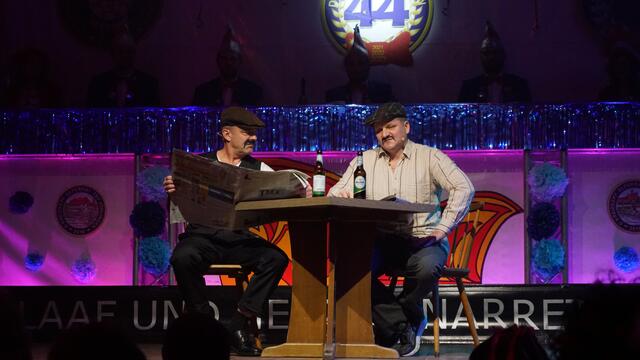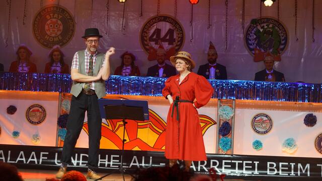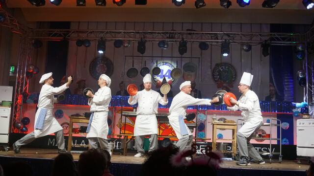 Nach Begrüßung und Gardetanz eröffnete Dennis Schiglewsky als Luise Struller die Bütt. „Man I feel like a woman“ – besser könnte ein Lied nicht passen, denn seine Bütt stand unter dem Motto: Frauen an die Macht, Männer bringen es eh nicht. Reiner Hofheinz und Thorsten Braun schlüpften in die Rolle von Bayrak und Orhan, die am Stammtisch über die deutsche Sprache philosophierten. Beim Zeitunglesen stießen sie auf so manches grammatikalische Problem und auf eindeutig zweideutiges. Mit Putzlappen, Staubwedel und Wäschekorb fegte die TSV Tanzgruppe (Leitung Natalie Reichert) regelrecht über die Bühne. Zuerst hüllte man sich noch in Schürze, doch spätestens beim Waschtag erstrahlten die Tänzerinnen und Tänzer blitzeblank im Glitzerkostüm.