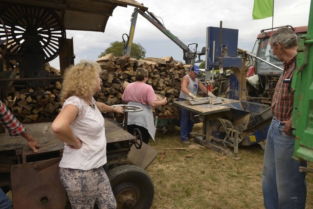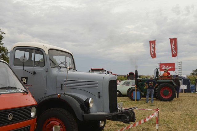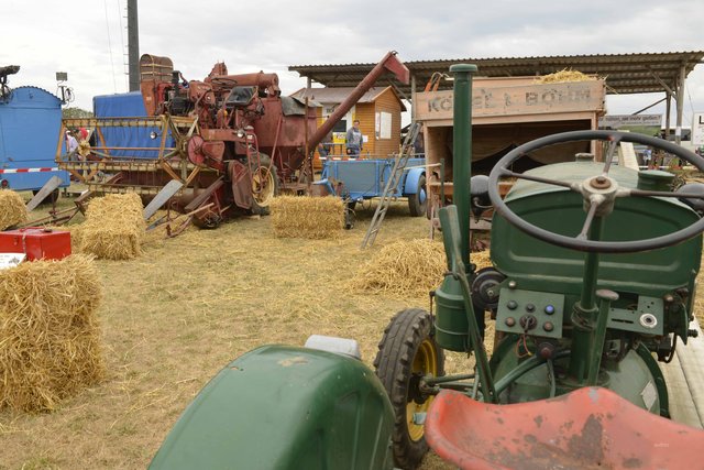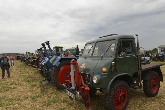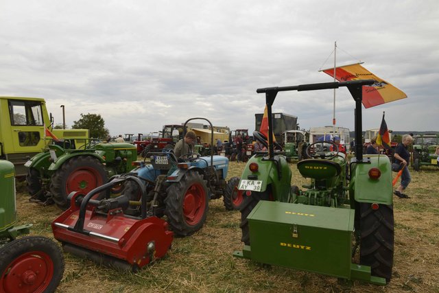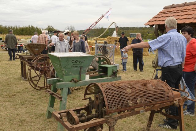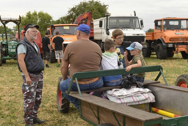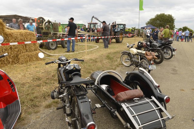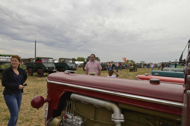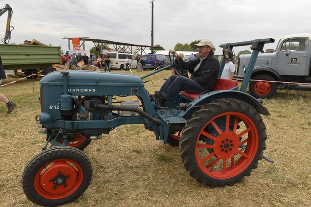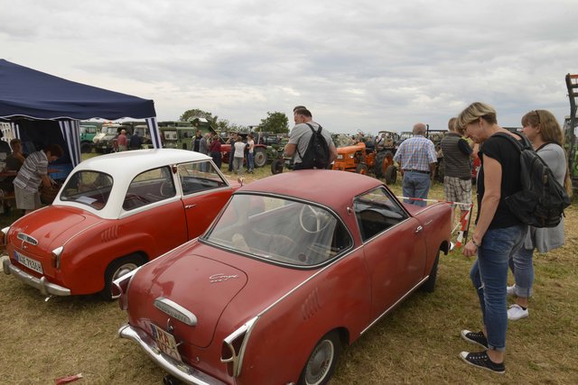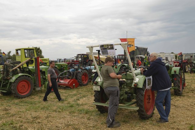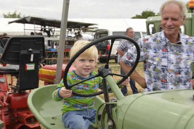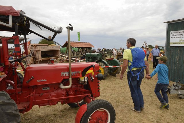 Eine teils weite und - bei den Spitzengeschwindigkeiten der Gefährte - natürlich auch entsprechend zeitraubende Anreise hatten viele der Fahrer auf sich genommen, um ihre Gefährte zur Schau zu stellen. Teils liebevoll und bis ins Detail resaturiert und nur noch zum Angucken, teils noch in Betrieb: Nichts suchten die Besucher vergeblich. Neben den Treckern fanden sich auch Oldtimer, so ein Ami-Schlitten der 50-er Jahre, Goggo-Mobile, alte Volkswagen. Auch alte Motorräder bestaunten die Besucher oder staionäre Maschinen, die früher dem Landwirt das Leben erleichterten. Ein Uraltmähdrescher der ersten Generation wartet noch auf Restaurierung, daneben drehte sich ein Kinderkarussell, selbstredend per Gelenkstange angetrieben durch einen Trecker. Auch eine Pumpe war zu bestaunen, in Bewegung gesetzt durch lange Riemen, die ein Bulldog antrieb. So flanierten die Besucher durch die vielen Reihen mit den historischen Fahrzeigen und kamen aus dem Staunen nicht mehr heraus: Manch einer fachsimpelte schon mal mit dem Besitzer eines Oldtimers, Kinder durften sich auf die alten Gefährte setzen, eine Runde drehen. Kameras und Handys wurden gezückt - wann sitzt denn der Enkel schon mal auf einem Trecker, der schon fuhr, als der Opa noch ein junger Mann war.