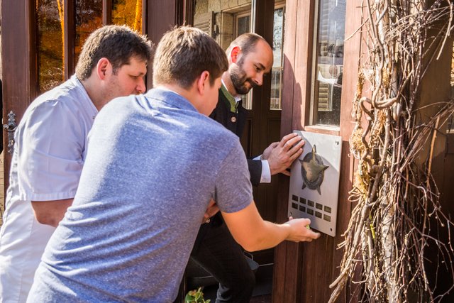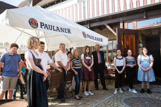 Oberderdingen (LSchm) Paulaner Teamleiter Gastronomie Qualitätsmanagement Thomas Recht, Vertriebsdirektor Gastronomie Markus Weiss und Gebietsverkaufsleiter Gordon Häußler, übergaben am Dienstag, 17. April, den "Stern der Gastlichkeit" an die sichtlich stolze Familie Lindner.