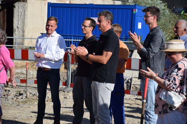 Mit dem zweiten Bauabschnitt kann begonnen werden, sobald die unter Artenschutz stehenden Fledermäuse von der noch stehenden Firmenhalle ins Dachgeschoss der denkmalgeschützten Alten Mühle umgesiedelt sind. Mayer hofft, dass es bereits im kommenden Jahr soweit ist. Die vorgeschriebenen Artenschutzuntersuchungen hatten unter anderem dazu beigetragen, dass sich die Vorarbeiten für den Wohnpark über mehr als vier Jahre hinzogen. Mit Verweis auf die christlichen Fundamente des Projektträgers bat Mayer sodann Pastor Bernhard Mast um ein geistliches Wort, worin dieser um den Segen Gottes für das Bauvorhaben bat. Denn: „Wir wollen, dass etwas Gutes dabei herauskommt.“ In Masts Worten: Keine Unfälle, gutes Arbeitsklima, gute Qualität. Anschließend ließen die Gäste die Feier auf Einladung des Sozialwerks bei einem geselligen Imbiss auf der anderen Bachseite ausklingen.