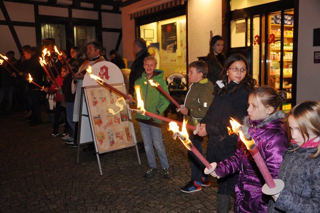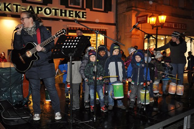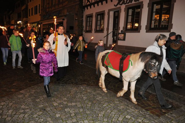 Angeführt von einem Pony sowie Pfarrer Harald Matthias Maiba und Fackeln tragenden Kindern bewegte sich der Laternenumzug durch die Brettener Fußgängerzone.