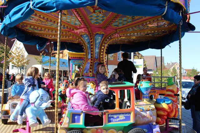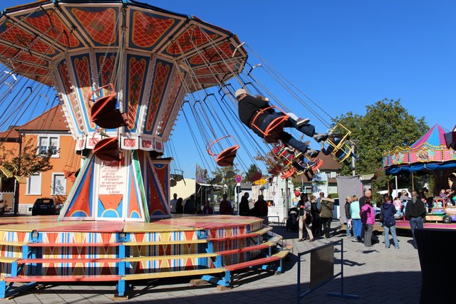Das Kettenkarussell vor der Kirche in Jöhlingen drehte im Sonnenschein seine Runden.
